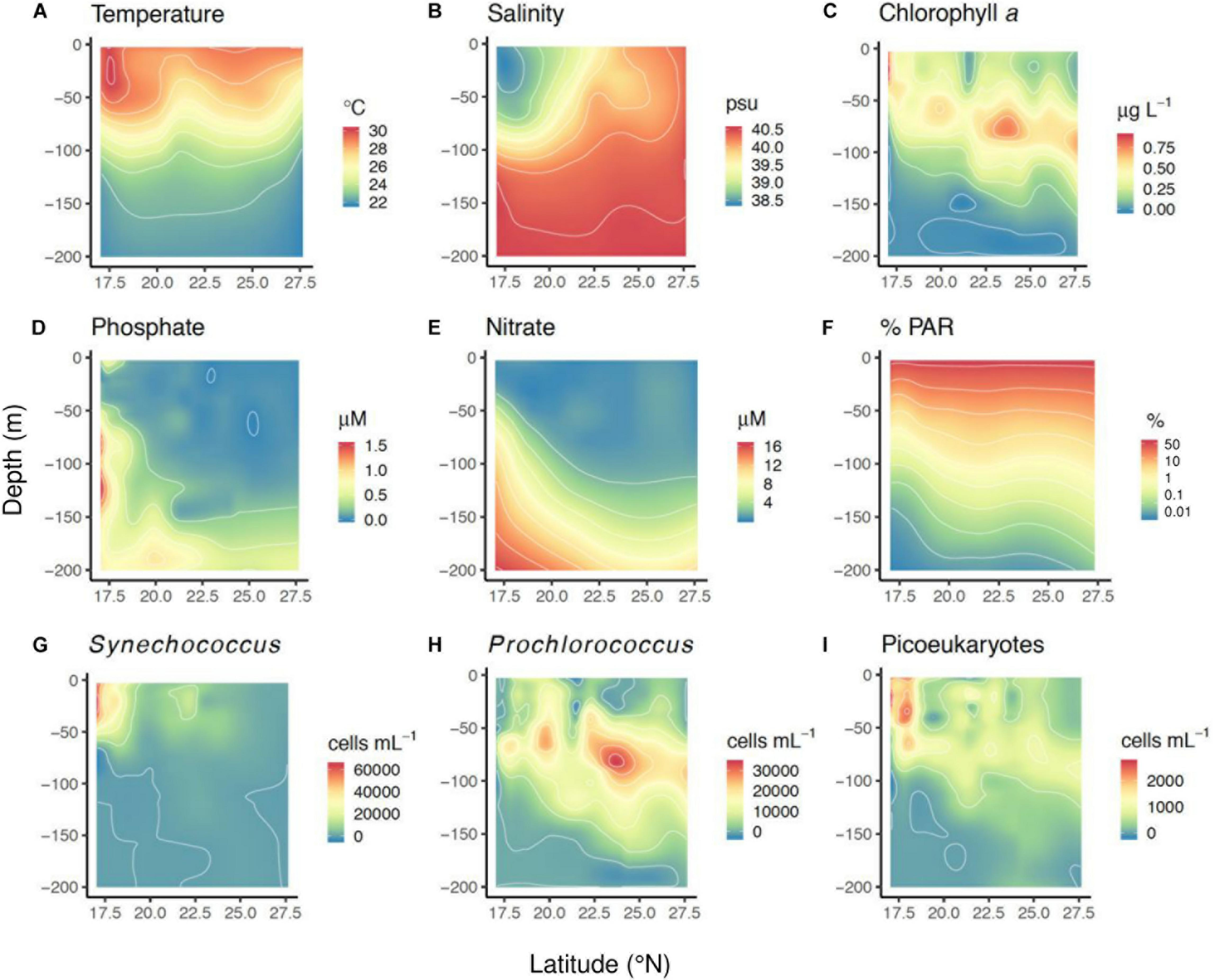 Contour plots showing the distribution with depth and latitude of (A) seawater temperature (°C), (B) salinity (psu), (C) chlorophyll a (μg L–1), (D) phosphate concentration (μM), (E) nitrate concentration (μM), (F) %PAR, (G) cellular abundance of Synechococcus (cells mL–1), (H) cellular abundance of Prochlorococcus (cells mL–1), and (I) cellular abundance of picoeukaryotes (cells mL–1), as measured during the study. These plots were created fitting a two-dimensional loess model to the actual values measured at each station and depth.