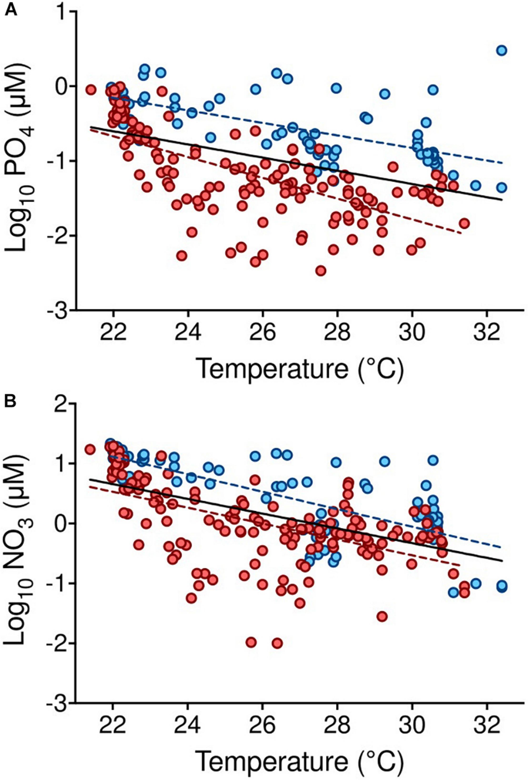 There were significant negative relationships between seawater temperature and nutrient concentrations (p < 0.0001, Figure 3). The linear equations of these relationships were: log10 PO4 (μM) = 1.34–0.09. Temperature (°C) (R2 = 0.19, F ratio = 50.4) (Figure 3A) and log10 NO3 (μM) = 3.37–0.12. Temperature (°C) (R2 = 0.3, F ratio = 93.1) (Figure 3B). For phosphate, concentrations showed a smoother decline with temperature at the southernmost stations when compared to stations at higher latitudes (two-tailed p value = 0.005): at southern stations (17.09–18.67°N), the linear equation was log10 PO4 (μM) = 1.7–0.08. Temperature (°C) (R2 = 0.38, F ratio = 43.35), whereas at higher latitudes (19.67–27.6°N) log10 PO4 (μM) = 2.4–0.14. Temperature (°C) (R2 = 0.44, F ratio = 109.3) (Figure 3A). The decline of nitrate with temperature did not differ significantly between the southern and central-northern stations (Figure 3B).
