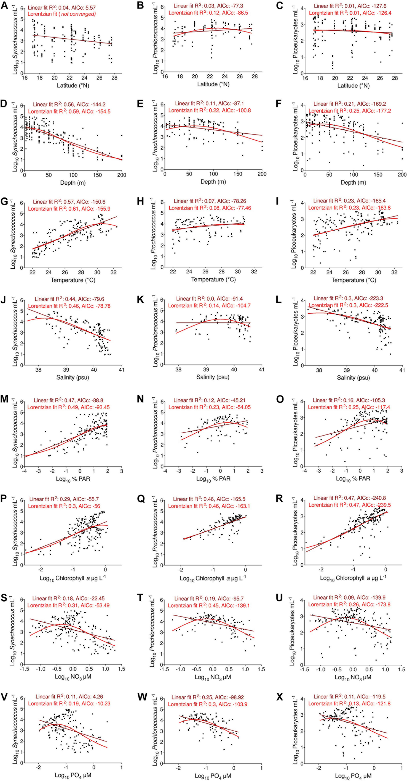 Relationships between the abundances of the three picophytoplankton groups under changes in (A–C) latitude, (D–F) depth, (G–I) temperature, (J–L) salinity, (M–O) %PAR, (P–R) chlorophyll a, (S–U) nitrate, and (V–X) phosphate concentrations in the Red Sea. Straight lines represent linear regression fits (brown) and Lorentzian curves (red). The R2 and AICc index for both fits are indicated at the top of each plot.