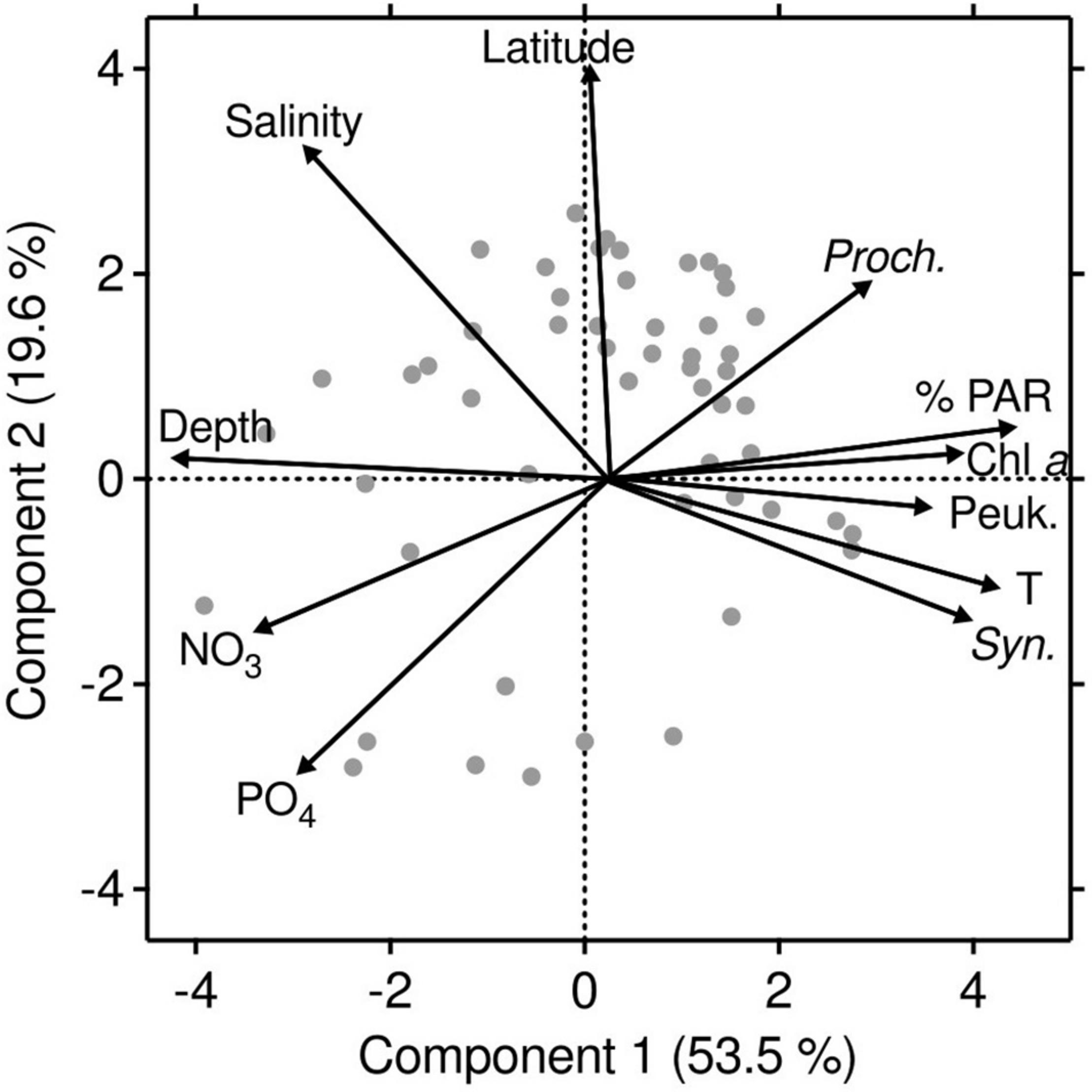 In order to assess the relationships between cell abundances and the set of environmental variables that characterize their environment we followed different multivariate methods. We applied a principal-component analysis (PCA) considering cellular abundances, depth, latitude, and environmental parameters (temperature, salinity, %PAR, chlorophyll a, nitrate, and phosphate) using JMP® Pro 12.1.0. This exploratory method allowed us to determine the set of linear combinations that explain most of the variance in cellular abundances and therefore illustrate the realized niches for each group. The cellular abundances and environmental parameters other than temperature and salinity were log-transformed prior to analysis.