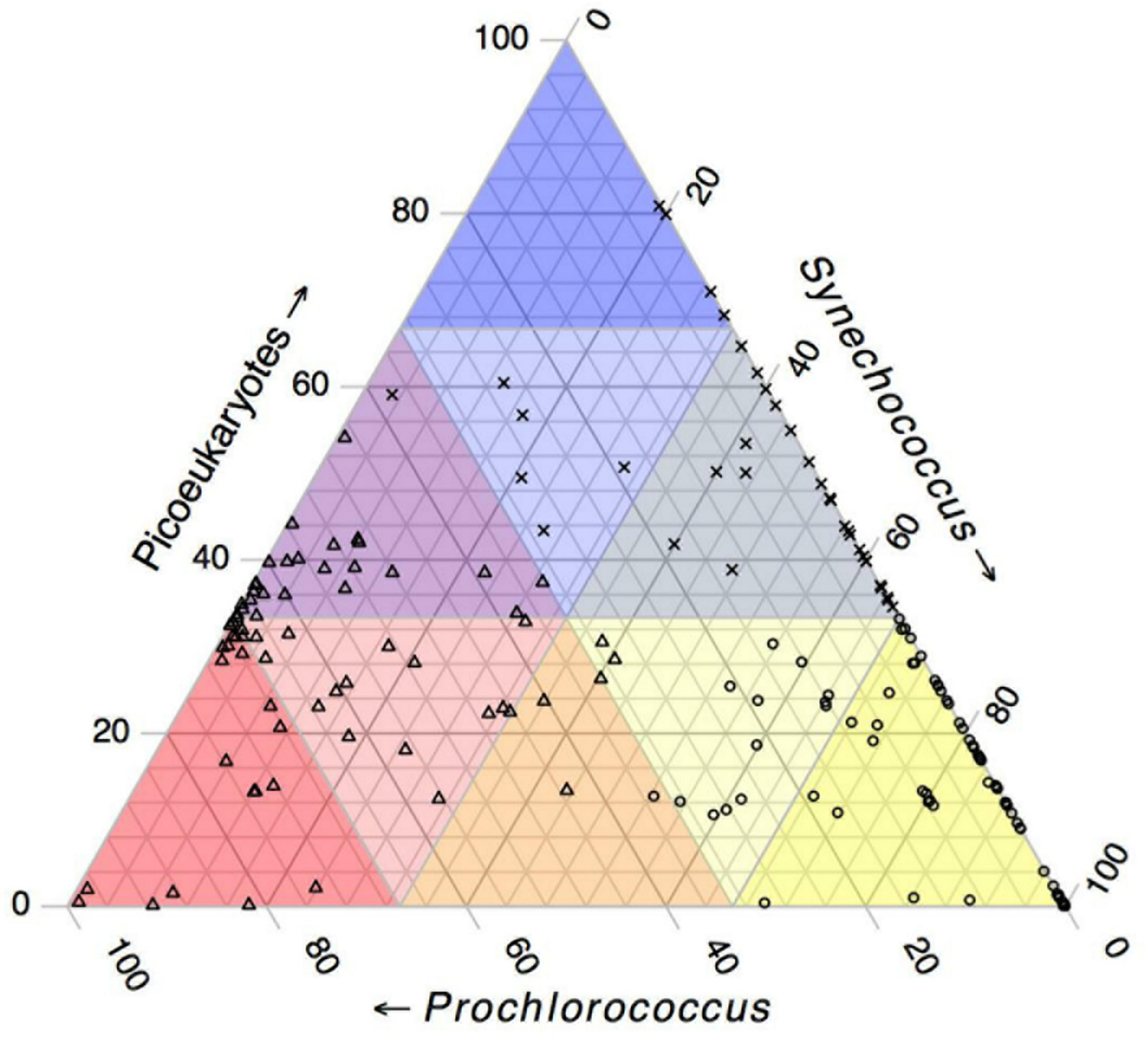 The abundances of the three groups in each of the different samples were converted to biovolume by assuming spherical cell shapes with diameters 0.6 μm for Prochlorococcus, 0.9 μm for Synechococcus, and 1.4 μm for picoeukaryotes (as defined in Raven, 1998). These were expressed as proportions of the total picophytoplankton community biovolume, and represented by compositional-data analysis on a ternary plot created in R (Ternary package) to illustrate three-dimensional cohabitation between the three groups.