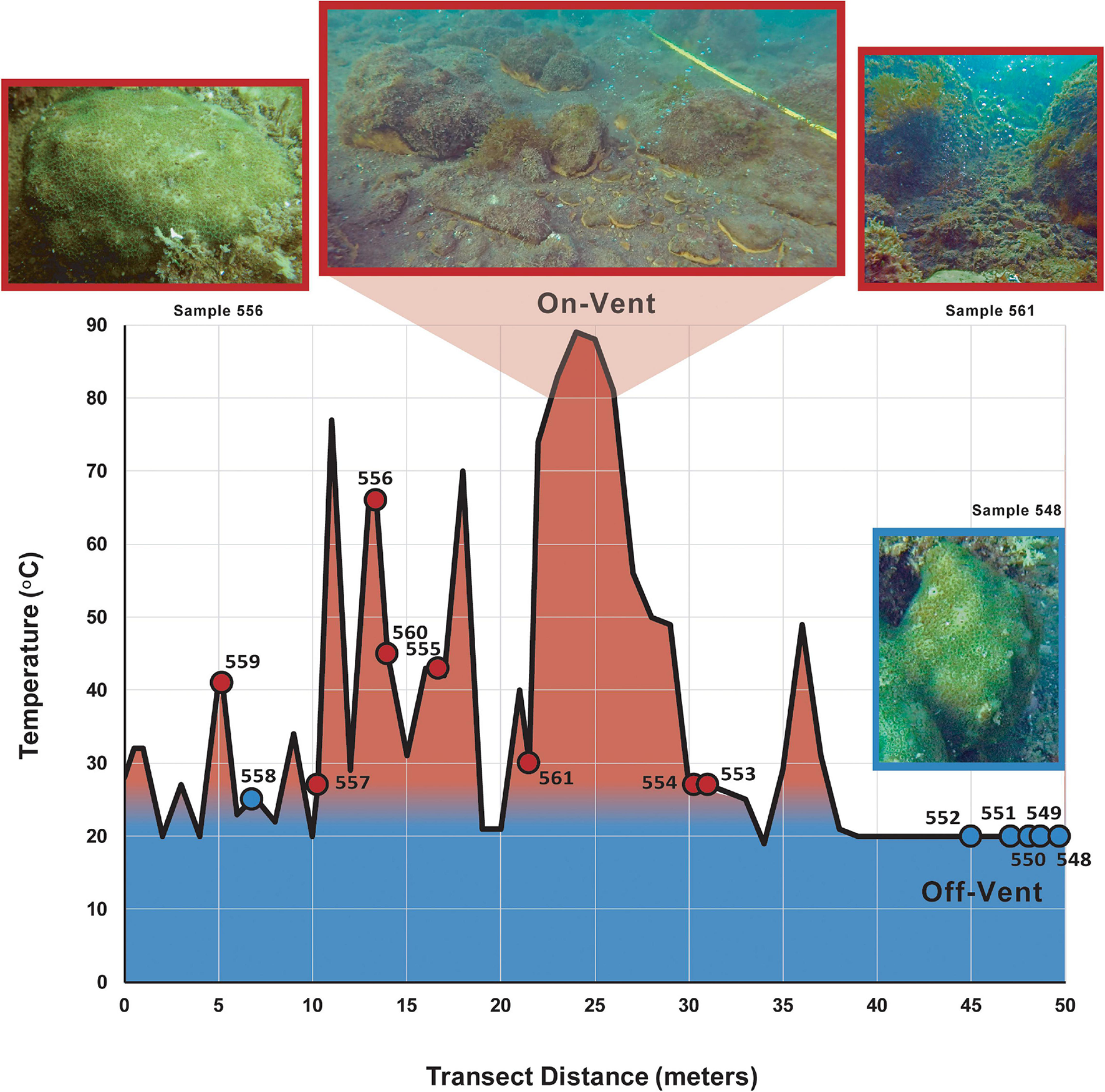 Temperature (red = warmer, blue = cooler) of the reef substrate along the 50 m collection transect. Circles indicate the sediment temperature nearest a sampled on-vent (red) or off-vent (blue) Porites panamensis colony (see Supplementary Table 1).