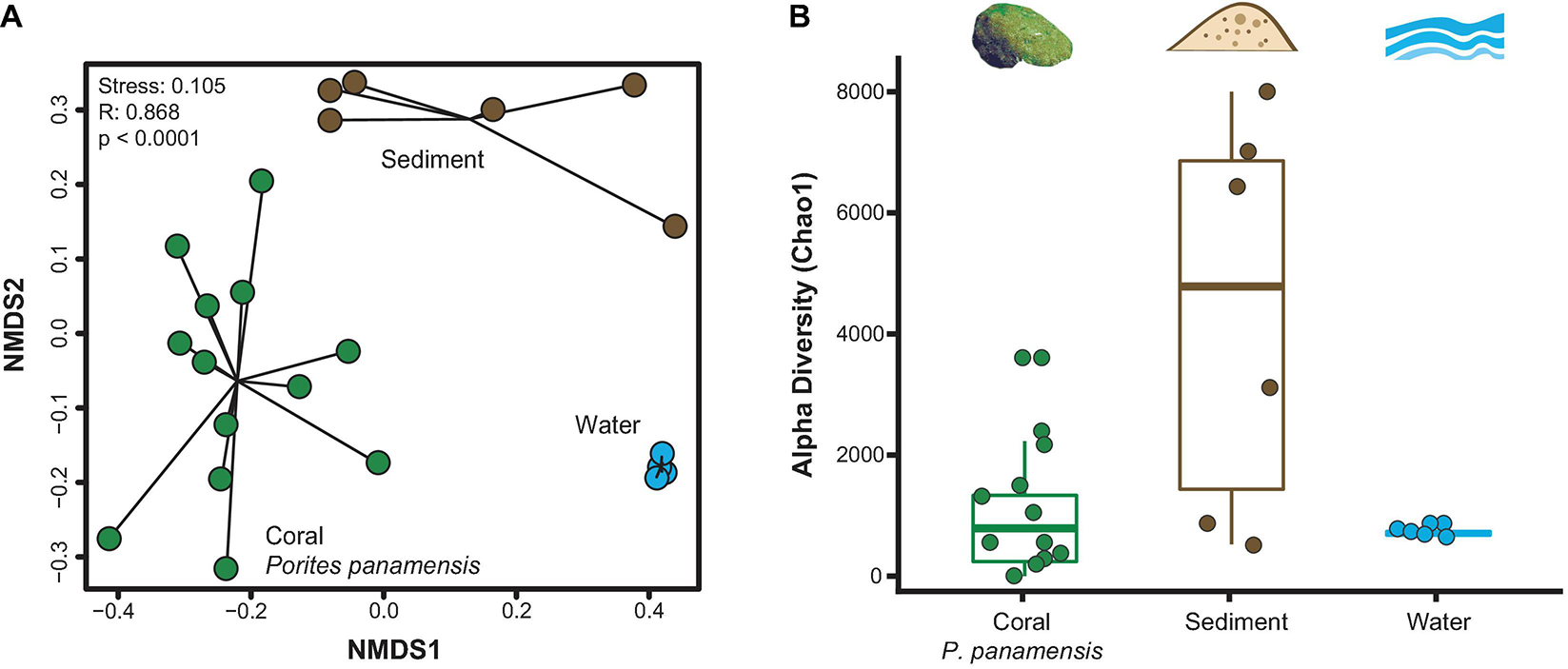 Microbial community diversity between rarefied Porites panamensis (green), sediment (brown) and water (blue) samples. (A) NMDS of beta diversity (Bray-Curtis) with black lines connecting samples of the same type to their centroid. (B) Alpha diversity (Chao1). The lower and upper hinges represent the first and third quartiles. The lower and upper whiskers extend to either the largest or smallest value that is no more than 1.5* the interquartile range.