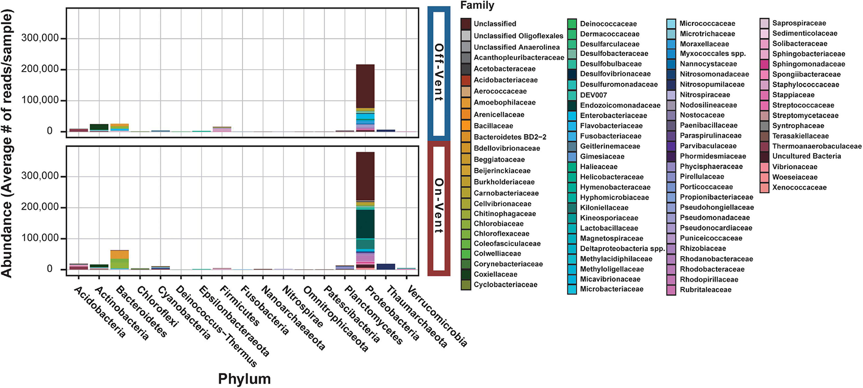 Relative abundance plots of high abundance ASVs (>500 reads) for off- (top) and on-vent (bottom) Porites panamensis samples. ASVs are clustered by phylum designation and colored by family.
