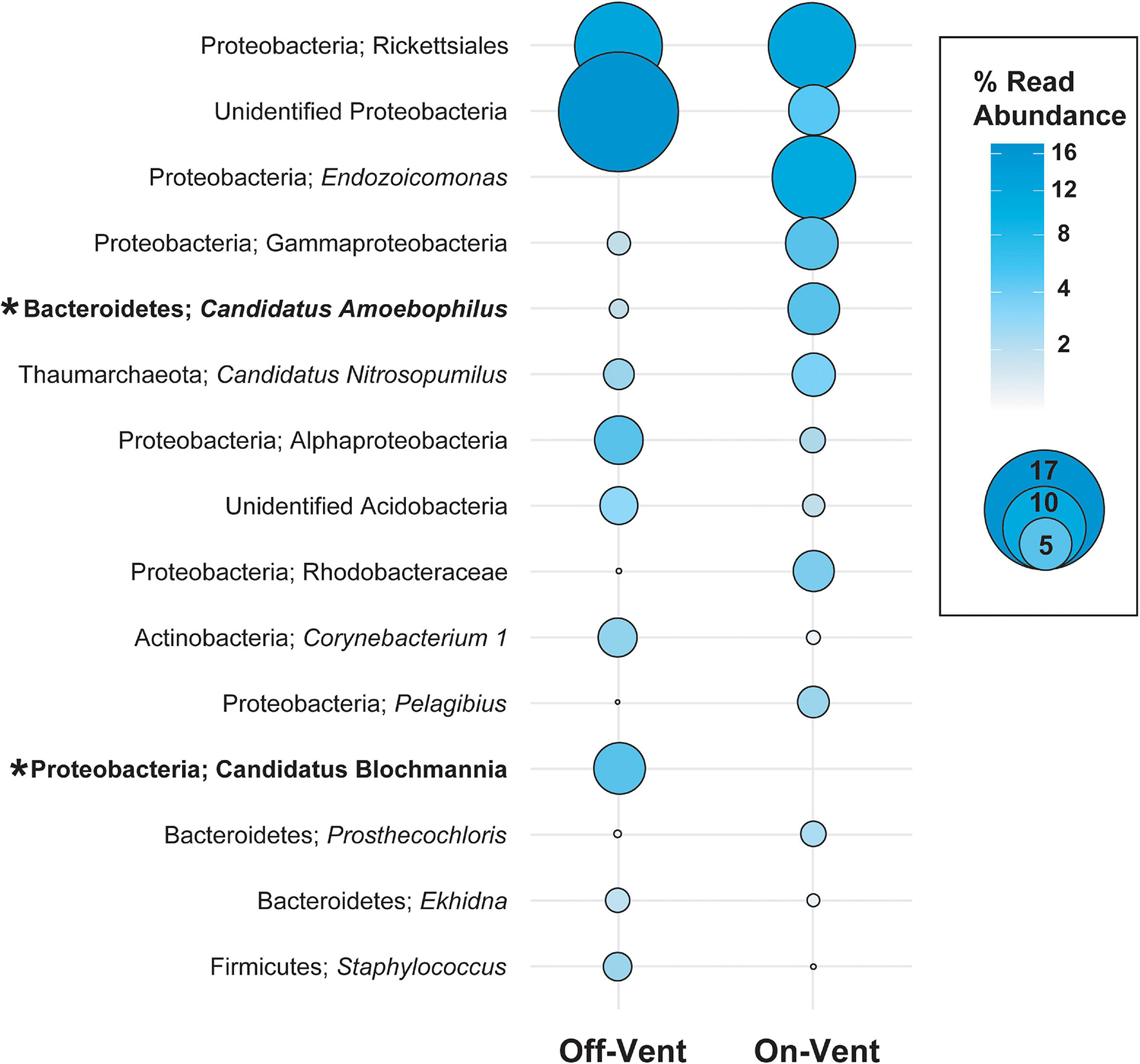 Relative abundance (in descending order) for the ten most abundant high abundance ASVs (>500 reads) in on- and off-vent Porites panamensis samples. Size of the circle indicates the relative abundance of the taxa within each group. Asterisks denote ASVs that were differentially abundant between off- and on-vent colonies.