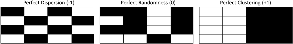 From Kates Varghese et al. (in review). Spatial configurations that would result in ideal Moran’s I values: left – perfect dispersion, Moran’s I value = −1; middle – perfect randomness, Moran’s I value = 0; right – perfect clustering, Moran’s I value = +1.