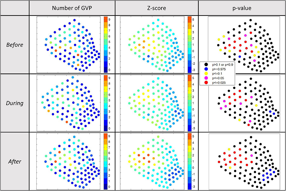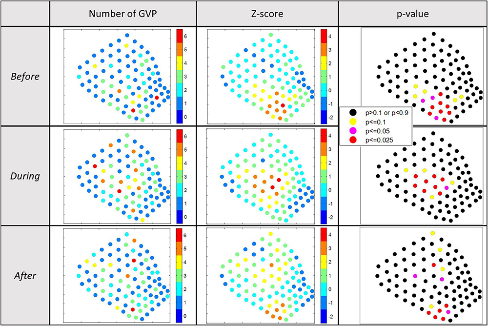 The total number of GVPs detected and the respective Gi∗ z-score for each hydrophone was calculated and is shown in the map presented in the first and second columns, respectively, of Figure 4 for each analysis period of 2017. To aid in the designation and interpretation of hot and cold spots in the Gi∗ results, p-values equal to or less than 0.1, or equal to and more than 0.9 were mapped along-side the Gi∗ results (Figure 4, column 3). Hydrophones with p-values of 0.1 or less provided the strongest evidence of hot spots on the Gi∗ plot, while a p-value of 0.9 or more provided the strongest evidence of a cold spot on the Gi∗ plot. Exact Gi∗ and p-values for all hydrophones are provided in the data section of this publication. Ultimately, a critical alpha level of 0.05 was used to guide the final interpretation of the Gi∗ results. Because of the two-tailed nature of this analysis (hot and cold spots), the authors focused on areas with p-values less than or equal to 0.025 (hot) or greater than or equal to 0.975 (cold) in the descriptive interpretation of the Gi∗ results that follows.