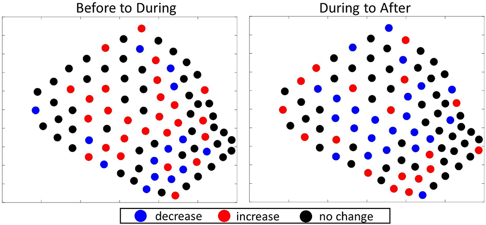 With respect to where there were very few GVPs, there was one cold spot hydrophone in the central-western part of the SOAR in the Before period and a small cluster of hydrophones signifying cold spots in the southeast corner of the SOAR During and After. Overall the southeastern corner – the relatively shallow and historically least-used area (Falcone et al., 2009; Schorr et al., 2014) – was not a high-use area for foraging beaked whales (Figure 4, column 1). Thus, the Gi∗ analysis further suggested no obvious spatial change occurred in beaked whale foraging effort among analysis periods in 2017 at a local level. This finding was supported by the difference plots for which the spatial distribution of hydrophones that exhibited no change, increase, or decrease in the number of GVPs appeared random (Figure 5).