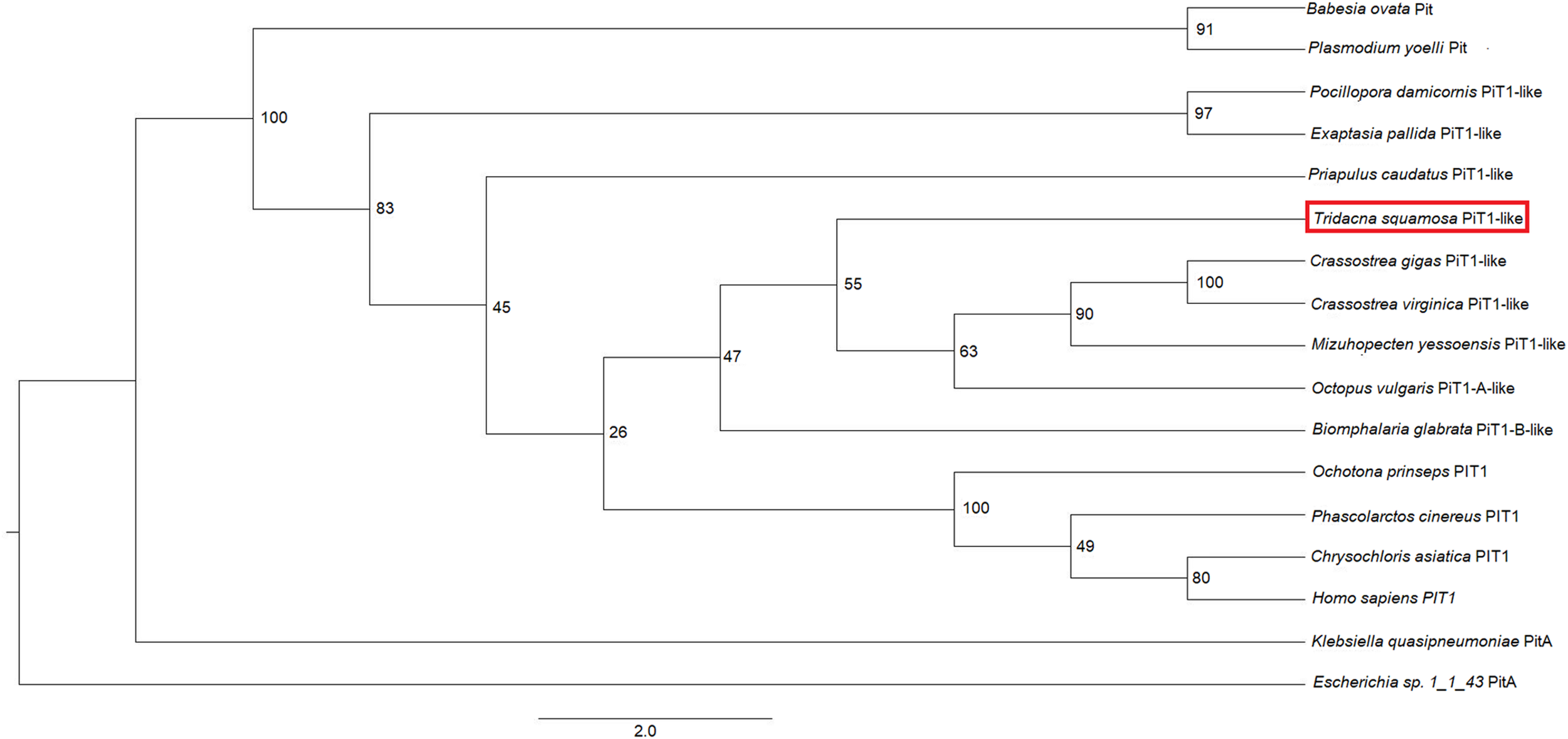 Phenogramic analysis of the homolog of sodium-dependent phosphate transporter protein 1 (PiT1-like) from Tridacna squamosa. Numbers shown at each branch point represent bootstrap values from 1,500 replicates. PitA from Escherichia sp. 1_1_43 PitA is used as the outgroup.