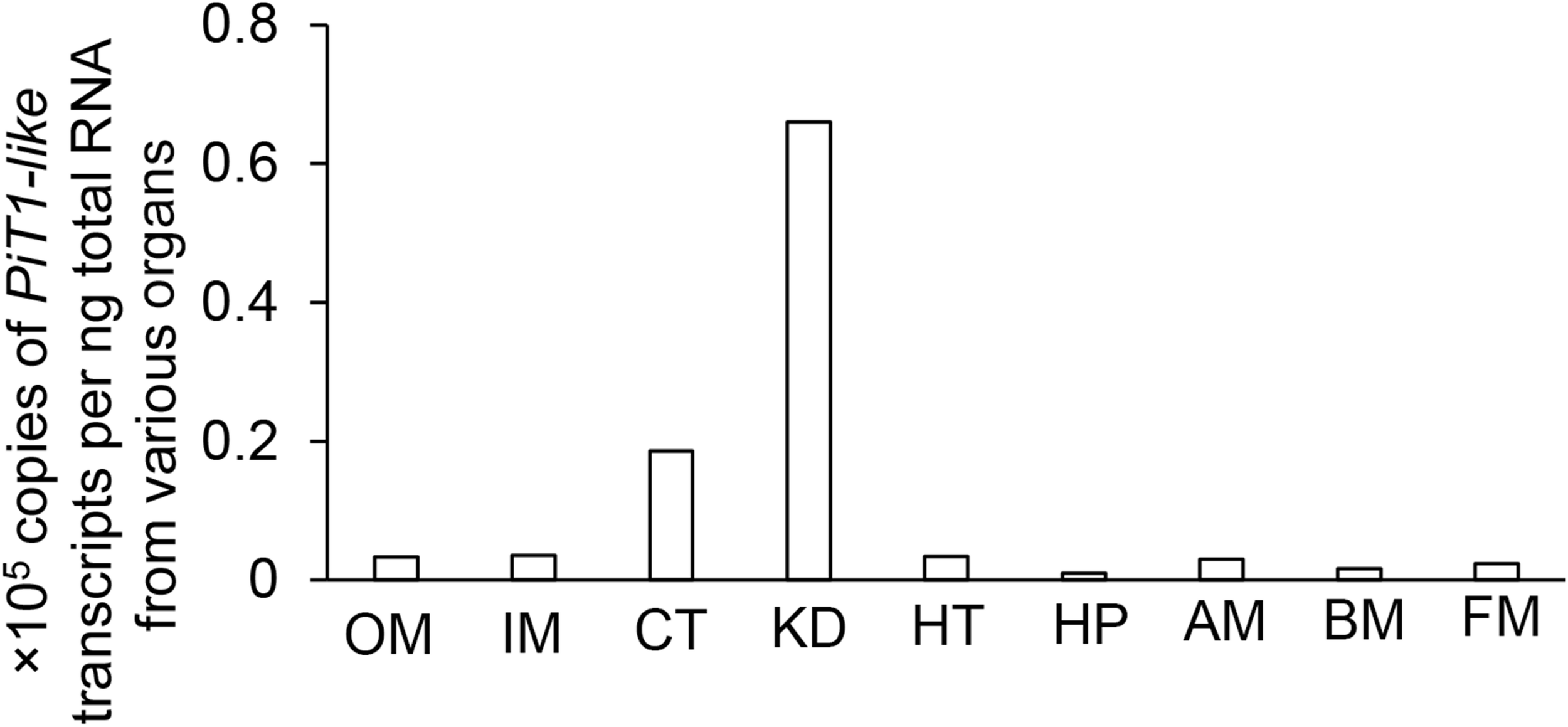 Gene expression of a homolog of sodium-dependent phosphate transporter protein 1 (PiT1-like) in the outer mantle (OM), inner mantle (IM), ctenidium (CT), kidney (KD), heart (HT), hepatopancreas (HP), adductor muscle (AM), byssal retractor muscle (BM), and foot muscle (FM) of Tridacna squamosa exposed to light for 12 h.