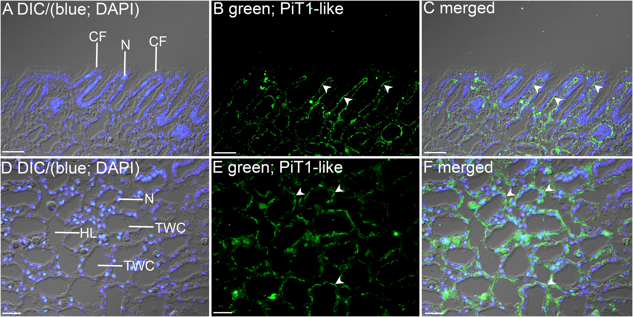 Immunofluorescence localization of a homolog of sodium-dependent phosphate transporter protein 1 (PiT1-like) in the filament (A–C) or the tertiary water channels (D–F) in the ctenidium of Tridacna squamosa exposed to 12 h of light. (A,D) Differential interference contrast (DIC) image is overlaid with DAPI nucleus (N) stain in blue to demonstrate the histological structure of ctenidium filament (CF) and tertiary water channel (TWC). (B,E) PiT1-like-immunofluorescence is displayed in green. (C,F) The green and blue channels are overlaid with DIC. Arrowheads in (B,C) show extensive basolateral staining of PiT1-like on the epithelium (EP) of CFs. (E,F) indicates the presence of PiT1-like on the basolateral membrane of the tertiary water channels. HL, hemolymph. Scale bar: 20 μm.