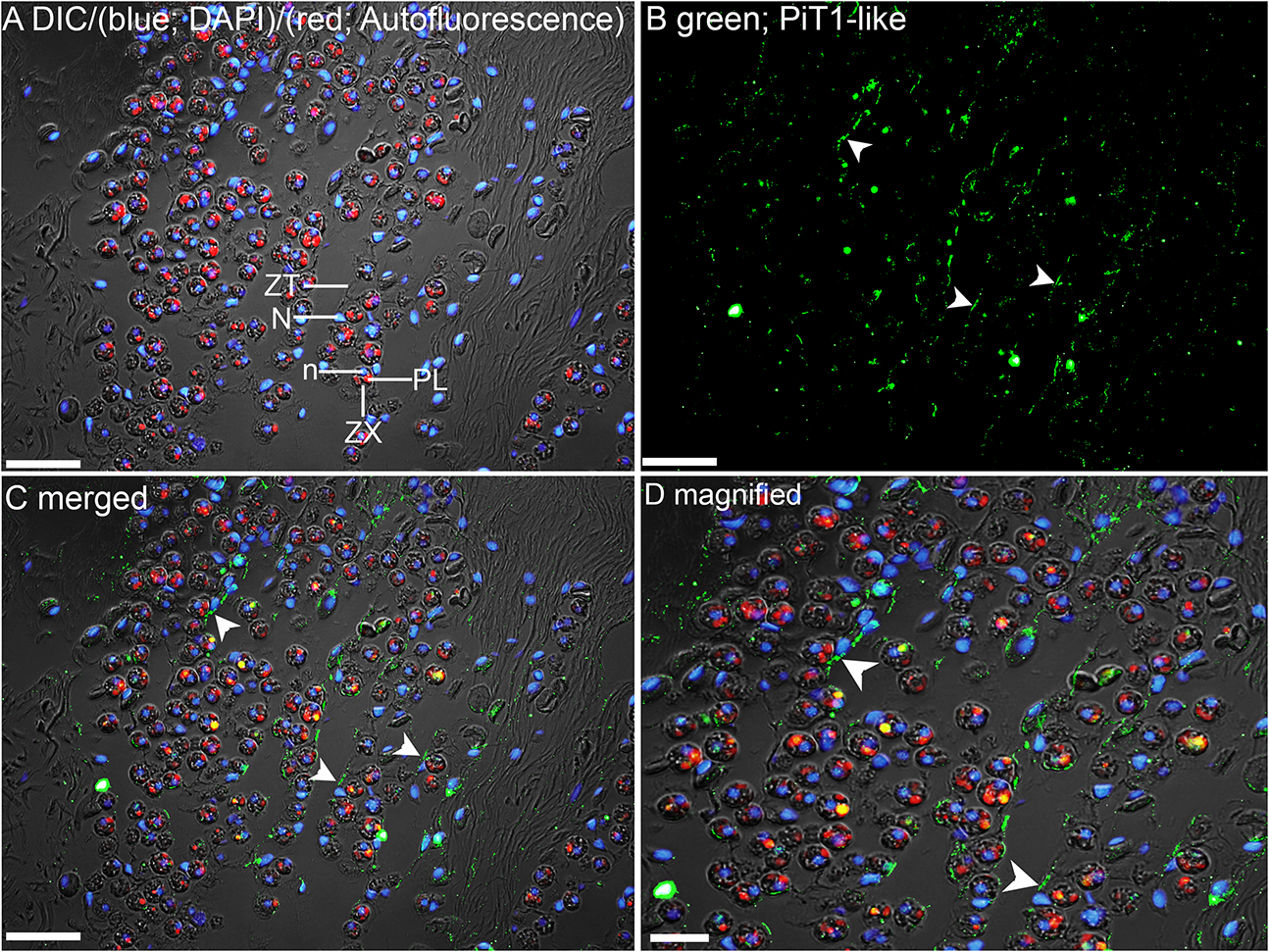 Immunofluorescence localization of a homolog of sodium-dependent phosphate transporter protein 1 (PiT1-like) in the outer mantle of Tridacna squamosa exposed to 12 h of light. (A) Overlaid image of differential interference contrast (DIC), auto-fluorescence of symbiotic dinoflagellates (zooxanthellae, ZX) in red, merged with that of DAPI (blue) staining of zooxanthellal nucleus (n) and nucleus (N) of host tubular epithelium (ZT). Red auto-fluorescence of ZX was due to plastid (PL). (B) Green immunofluorescence staining of the epithelial cell linings of the basolateral membrane of ZT (labeled with arrowheads) indicates presence of PiT1-like protein. (C) Merged images of DIC, DAPI, red, and PiT1-like immunolabeling. (D) Magnified view of (C). Scale bar: 20 μm.