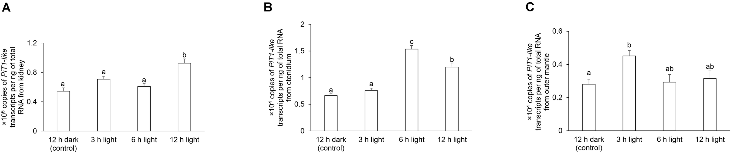 Transcript levels of a homolog of sodium-dependent phosphate transporter protein 1 (PiT1-like) from the (A) kidney, (B) ctenidium, and (C) outer mantle of Tridacna squamosa kept in darkness for 12 h (control), or exposed to light for 3, 6, or 12 h. Transcript levels of PiT1-like expressed as ×105 copies of transcript per ng total RNA for kidney, or ×104 copies of transcript per ng total RNA for ctenidium and outer mantle. Results represent means + SEM (n = 4). Means not sharing the same letter are significantly different (p-value < 0.05).