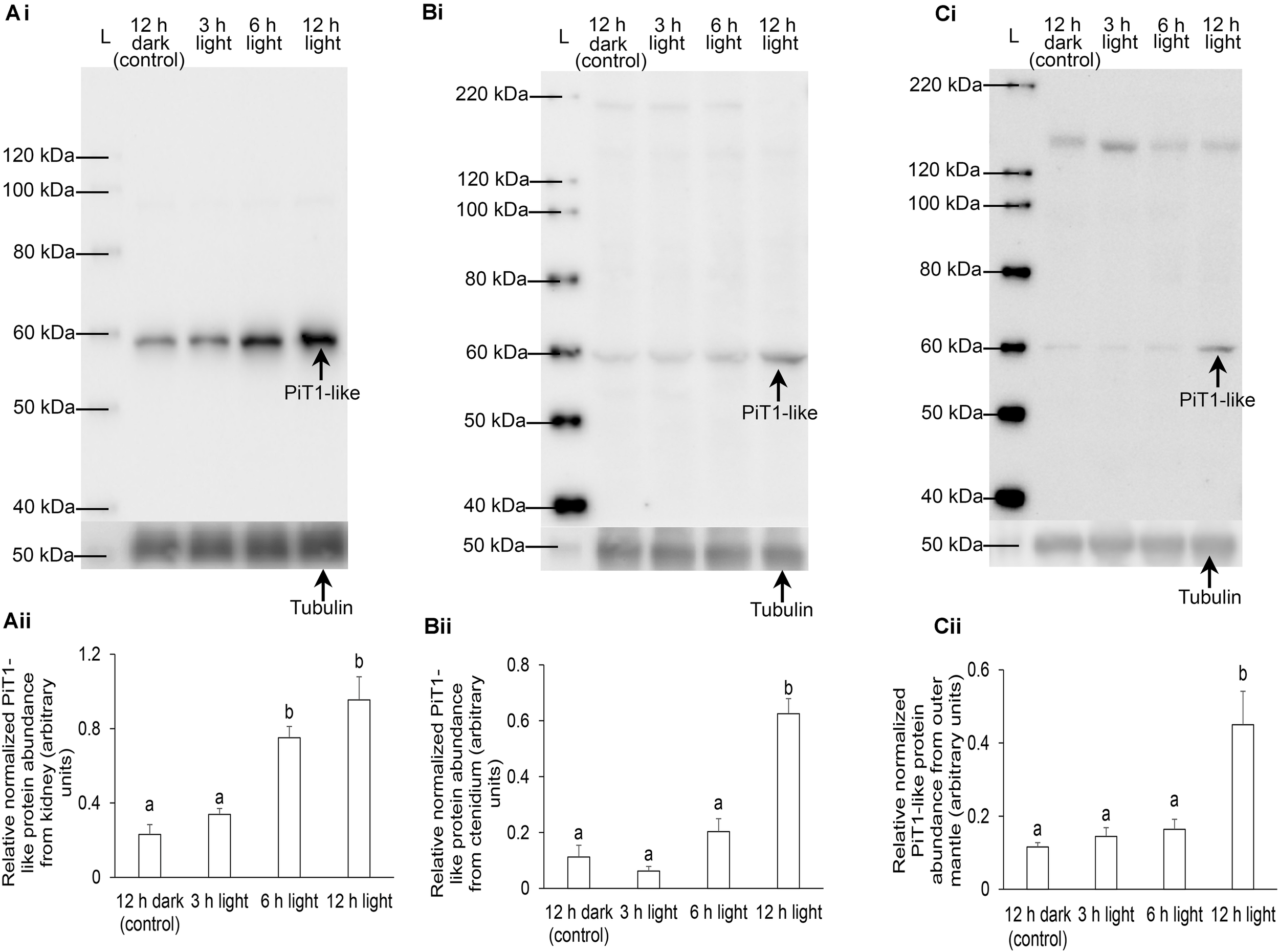 Protein abundance of a homolog of sodium-dependent phosphate transporter protein 1 from the (A) kidney, (B) ctenidium, and (C) outer mantle of Tridacna squamosa kept in darkness for 12 h (control) or exposed to light for 3, 6, or 12 h. (i) A representative blot. L represents ladder. (ii) The optical density of the PiT1-like band for 20, 50, and 100 μg of protein from kidney, ctenidium, and outer mantle, respectively, was expressed as arbitrary units and normalized with respect to that of tubulin from each tissue. Results represent means + SEM (n = 4). Means not sharing the same letter are significantly different (p-value < 0.05).