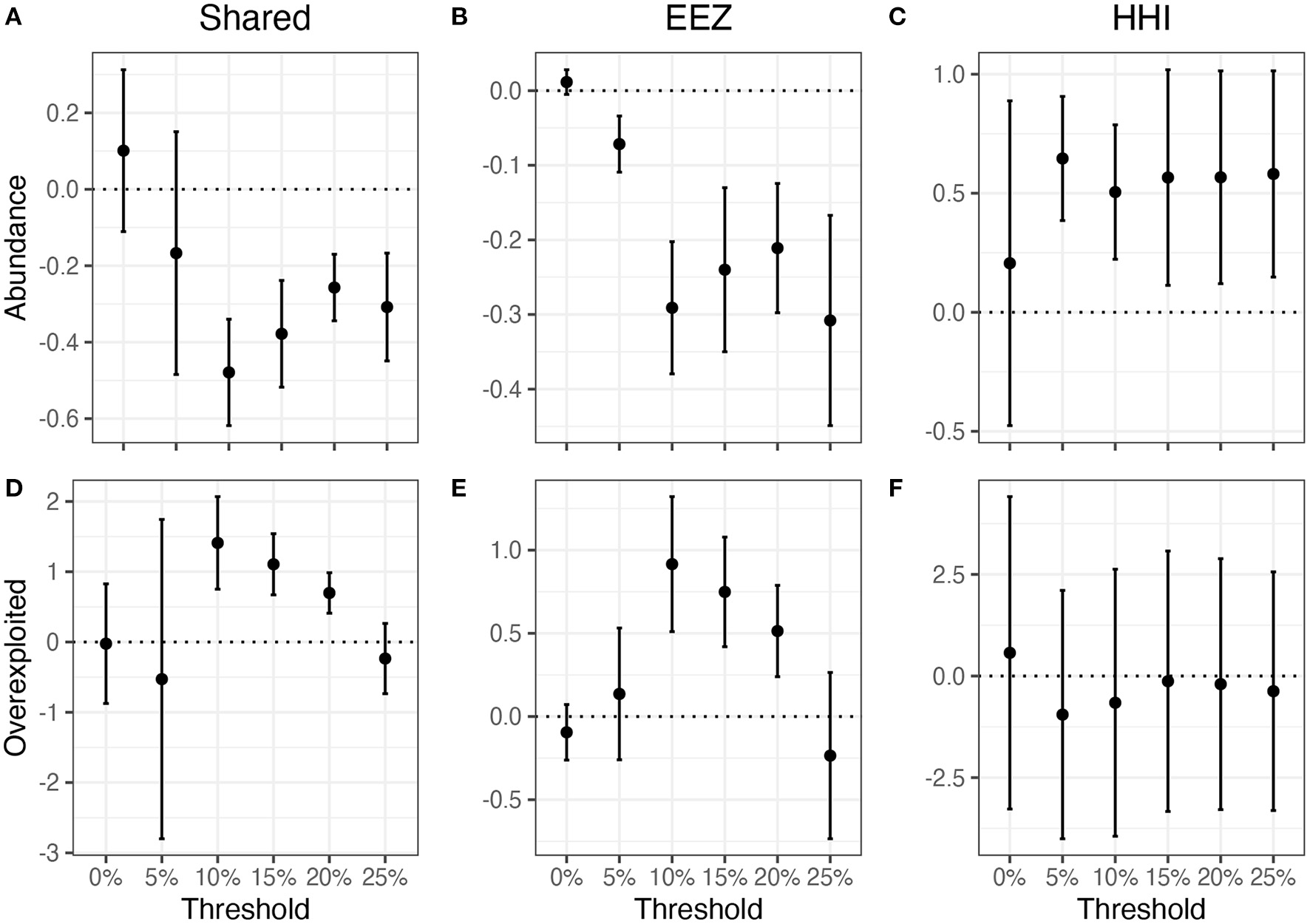 Although our analysis is global in scale, clearly not all transboundary fisheries situations are equivalent. To the extent possible, we queried a range of definitions of “transboundary” in our analyses, including varying the spatial threshold required for stock ownership and investigating the effect of multiple measures of transboundary: binary sharing (i.e., is a resource shared or not), total number of EEZs, and relative stock concentration across EEZs. Although the significance of the transboundary effect is consistent across most model specifications, our results also highlight important nuances that should be incorporated in any future studies on transboundary effects. For example, one key choice and contribution of our study is to allow the spatial threshold required for stock ownership to vary. In practice, defining transboundary fisheries using a very low threshold means that a large number of stocks are categorized as shared, but at the same time the proportion of the stock spanning a second or third EEZ may be extremely small (e.g., 0 to 5 percent of its range). The competition effect in such cases may be minimal, as stocks marginally overlapping additional EEZs would be classified as shared but may perform as if they were completely enclosed in just a single EEZ. Consequently, the degree and nature of shared ownership matters at least as much as the binary condition of whether or not a resource is shared. Our estimates for the effect of relative stock concentration (HHI) support this conclusion as well—fish stocks spanning the same number of EEZs, but concentrated among those EEZs differently, have different expected outcomes.