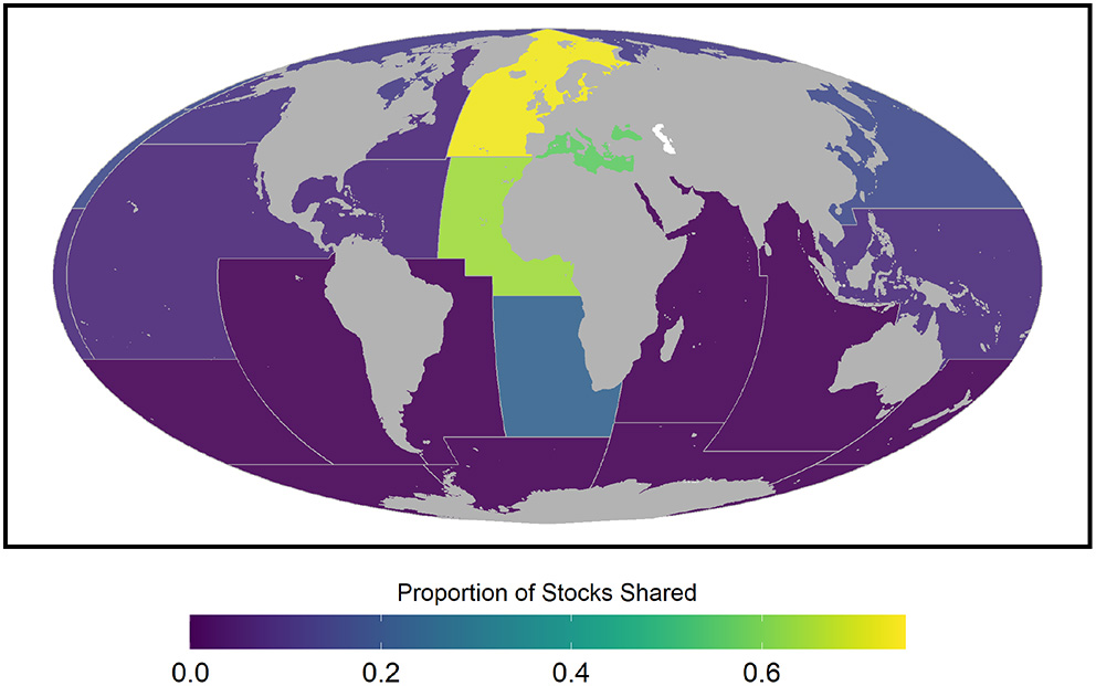 Utilizing the full dataset of 780 stock spatial distributions to calculate the proportion of fish stocks that are transboundary across world regions, we find that the transboundary burden is greater in some regions than others (Figure 3). Some regions have a low proportional burden of transboundary stocks, such as North America, where large fishing nations like Canada and the United States control enormous national EEZs. However, some regions are at much greater risk of negative transboundary effects, most notably in Europe and the eastern Atlantic.