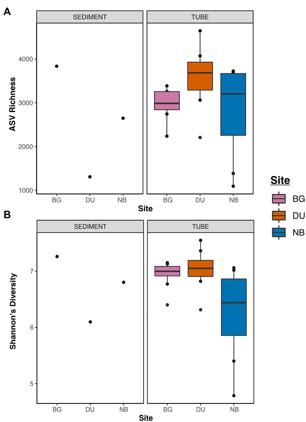 Dot and box-whisker plots of alpha diversities of sediment and tube samples across all three sites [Duke University Marine Lab (DU), Bogue Sound (BG), and North Bridge (NB)] relative to amplicon sequence variant (ASV) richness (A) and Shannon diversity (B).