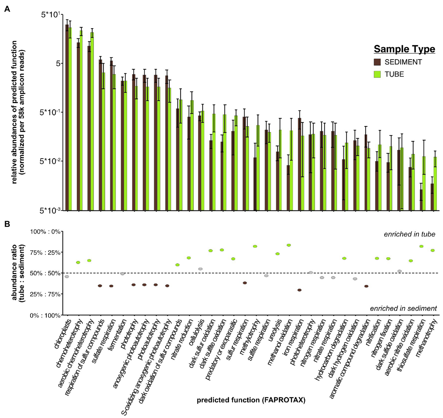 (A) Distribution of normalized abundances of predicted functions (via FAPROTAX) for sediment and tube microbial samples. (B) Ratio of abundance between tubes and sediments for each inferred functional group determined by FAPROTAX classification.