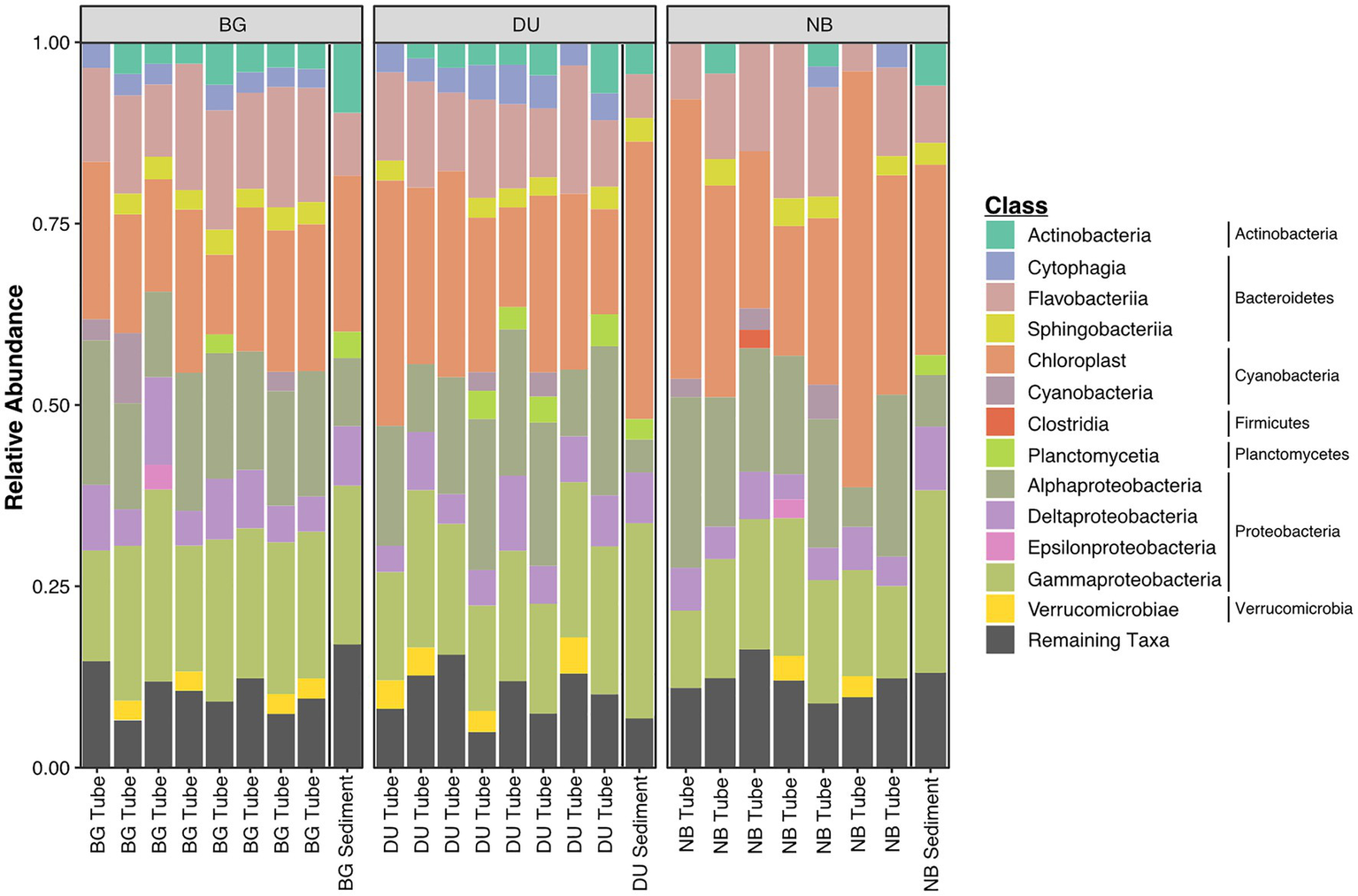 Relative abundance of microbial classes and phyla for 16S-rRNA amplicon sequence reads from tubes and sediments samples from all three sites (DU; Duke University Marine Lab, BG; Bogue Sound, and NB; North Bridge). Phylum that were >0.1% of the entire dataset were classified into appropriate class or phyla levels, whereas ASVs <0.1% were classified as “remaining taxa.”