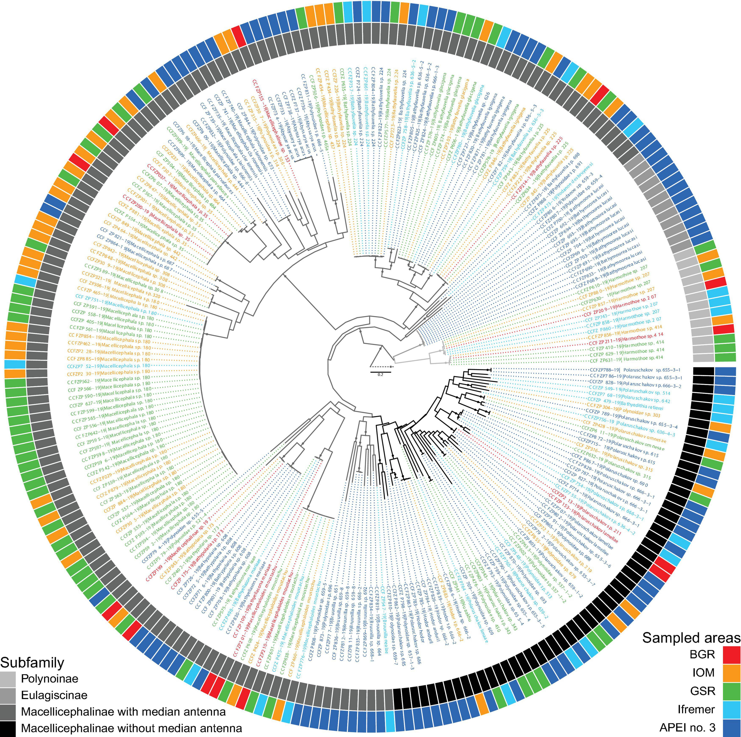 Maximum likelihood and Bayesian phylogenetic analyses were run for two datasets. The first dataset included all 428 sequences (COI, 16S, and 18S) from 238 specimens collected by all types of gear from all study sites. Two sigalionids [Neoleanira tetragona (Örsted, 1845) and Sthenelais boa (Johnston, 1833)] were chosen as outgroups. The phylogenetic analyses aimed at providing a comprehensive account of known polynoid diversity in the eastern CCFZ. The second dataset was limited to specimens collected from the fully processed EBS samples and included 156 sequences (COI, 16S, and 18S) from 81 species. N. tetragona was used as an outgroup. The phylogenetic analyses were run to compute phylogenetic diversity indices (see below).