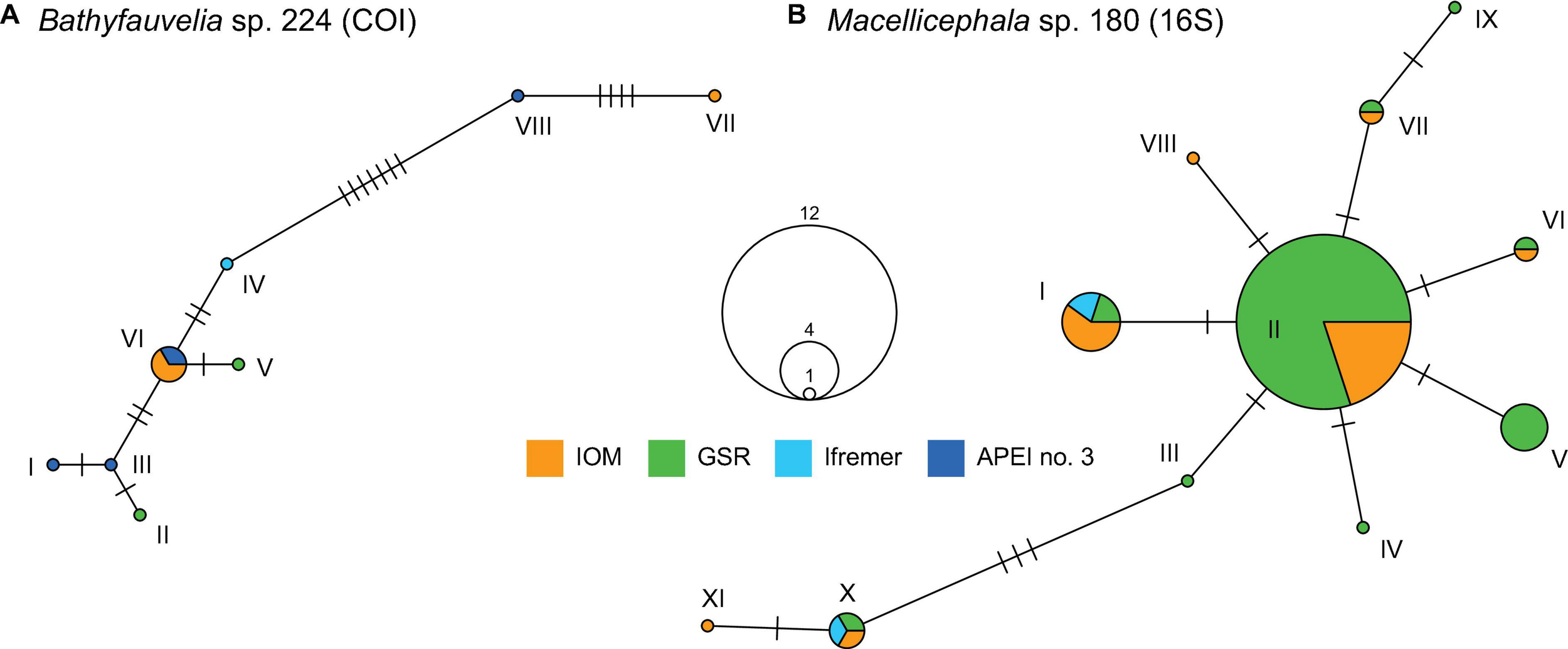 Unweighted (presence/absence) UniFrac metric (Lozupone et al., 2006) was computed to assess beta phylogenetic diversity between assemblages. The metric measures the difference between assemblages based on the unique branch length (branch leading to another tip in the same sample) over the total branch length observed among assemblages. UniFrac metric ranges from 0 (i.e., no unique branch, all the terminals on the tree are shared among all assemblages) to 1 (i.e., only unique branches, the terminals leading to another tip are not shared between assemblages). Ordination of samples based on UniFrac distance metric was performed using Principal Coordinate Analysis (PCoA; Gower, 1966). PCoA, also known as metric multidimensional scaling, is an ordination method similar to PCA but that can handle semimetric and non-metric dissimilarity measures (Borcard et al., 2018). Furthermore, a correlation between UniFrac distance and geographical distance was sought to test for a distance decay of phylogenetic similarity between polynoid assemblages. The UpSet plots were used to illustrate the distribution of rare, widely distributed and common species across the CCFZ. Haplotype networks were constructed considering the infinite site model and a pairwise uncorrected distance between mitochondrial (COI or 16S genes) haplotypes, and the quantitative distribution of haplotypes within putative populations (sampling site).