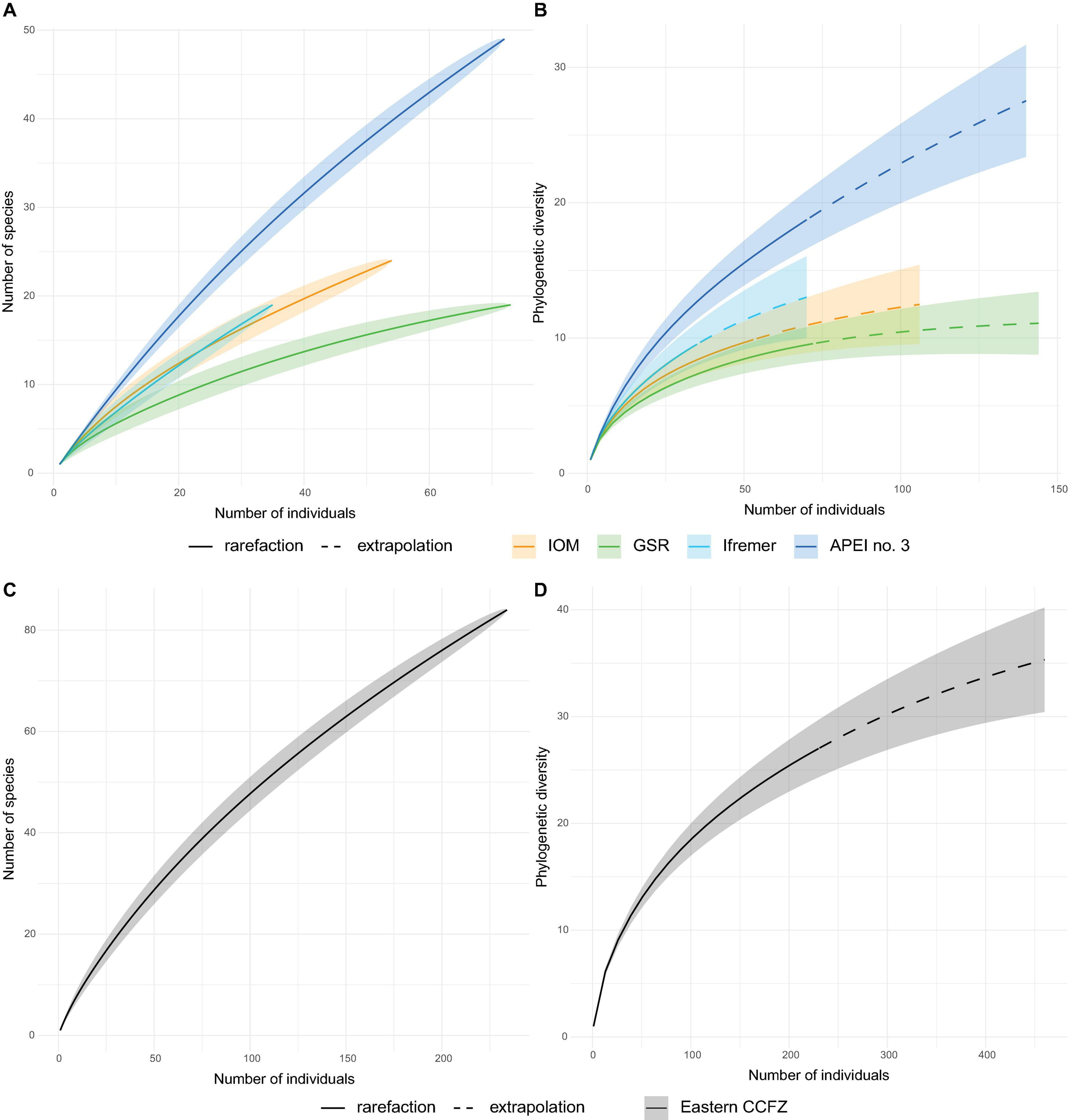 Phylogenetic diversity was assessed using Faith’s PD (Faith, 1992). PD is the most widely used phylogenetic diversity measure and is defined as the sum of branch lengths of a phylogenetic tree connecting all species in a given assemblage. Similar to species richness, Faith’s PD is also dependent on sample size and inventory completeness (Hsieh and Chao, 2017). We thus used sample-size-based rarefaction and extrapolation curves to compare PD between polynoid assemblages (Hsieh and Chao, 2017). Extrapolations were computed for a sample twice the size of the empirical sample. The 95% confidence intervals were computed using a bootstrap method with 200 replications. For PD, the phylogenetic ultrametric tree was pruned to only reflect species with at least one sequence present in the entire dataset (i.e., without outgroup species or specimens without a sequence).