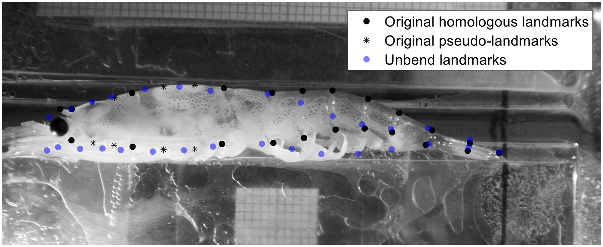 Landmark-based geometric morphometrics sees a biological shape expressed as a series of cartesian coordinates representing the positions of homologous landmarks and pseudo-landmarks (Webster and Sheets, 2010; Cooke and Terhune, 2014). Homologous landmarks are placed at anatomical locations, such as the rostrum on a crustacean, which are identifiable on all specimens of the same species. The use of homologous landmarks allows for repeatable comparison between specimens of similar morphology (Bookstein, 1992; Rohlf and Marcus, 1993). Additional pseudo-landmarks can also be included in areas where homologous landmarks are sparse, to better define the shape. These landmarks are often placed around the outline or at the end of structures (Rohlf and Marcus, 1993). Their positions must be clearly defined to ensure they are comparable across specimen.