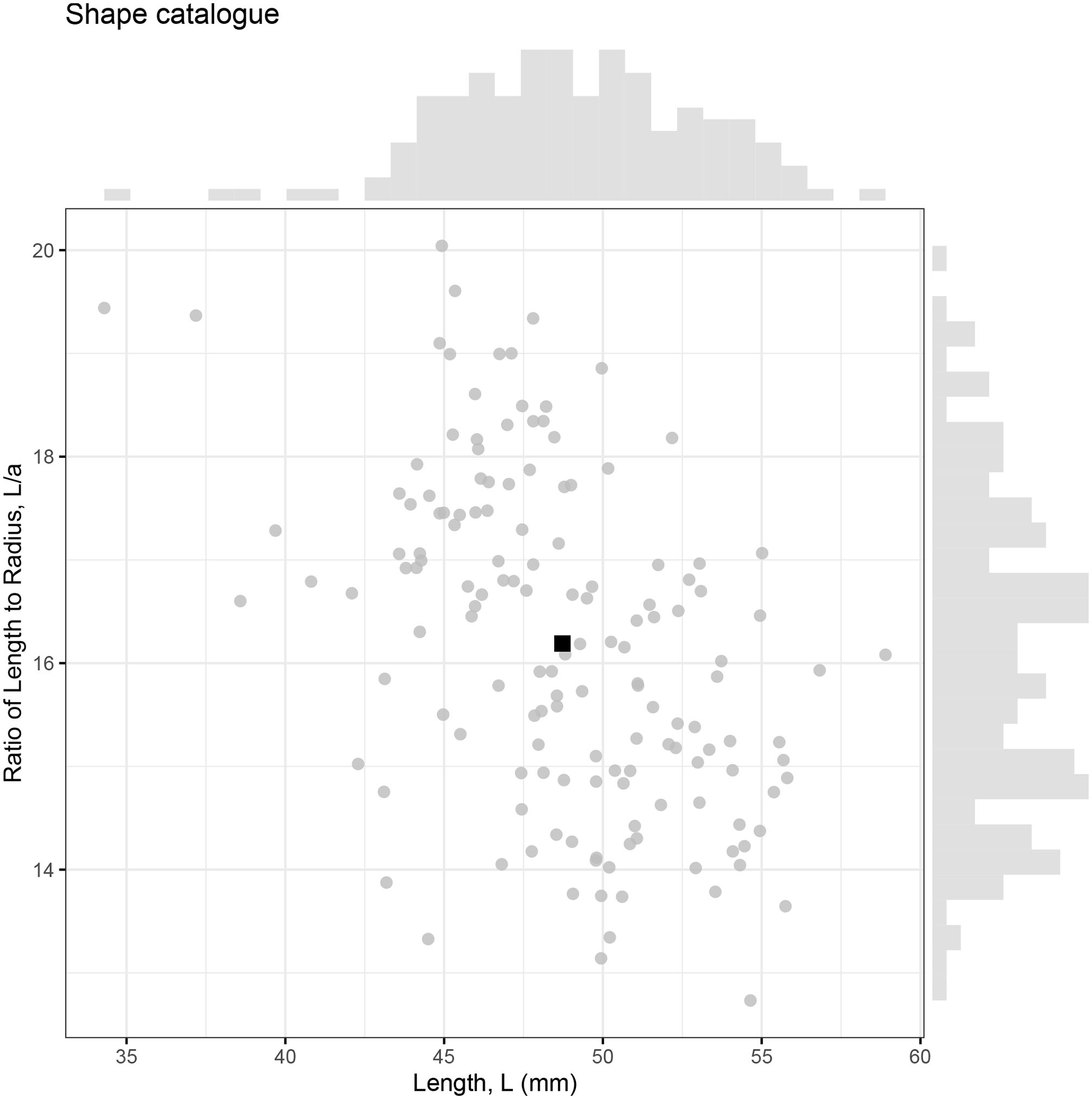 Landmarks configurations were produced for 147 photographed krill, which were then converted into individual shape profiles compatible with ZooScatR. Figure 5 displays the distribution of krill sizes in terms of the linear measurements of length, L, and ratio of length to maximum radius, L/a. The average length is 48.7 mm with a standard deviation of 4.1 mm. The average ratio of length to radius is 16.2 with a standard deviation of 1.6. The average krill shape, calculated from the 147 individual shapes using geometric morphometrics, takes these average values as its length and ratio of length to radius. This catalog of krill shapes illustrates the diversity of realistic krill body shapes; however it is not assumed to be necessarily representative of the full range of body shapes possible.