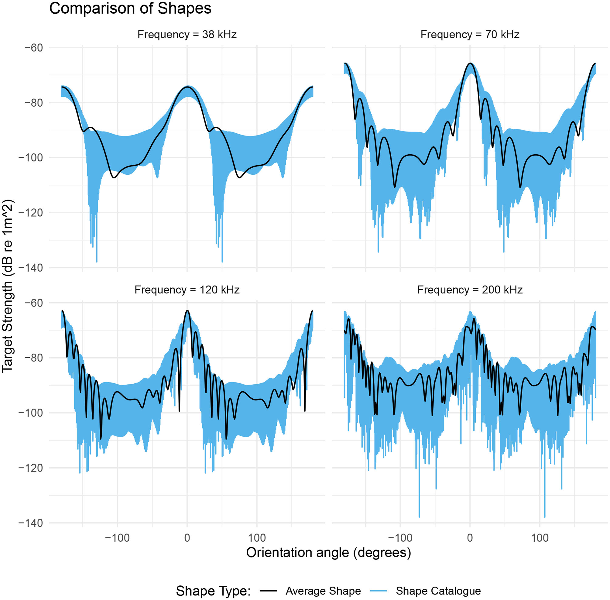 Target strength of the average shape falls within the range produced by the shape catalog in 87% of cases across all four acoustic frequencies. The general trend in target strength, with orientation angle, is also similar for both the shape catalog and the average shape, Figure 6.