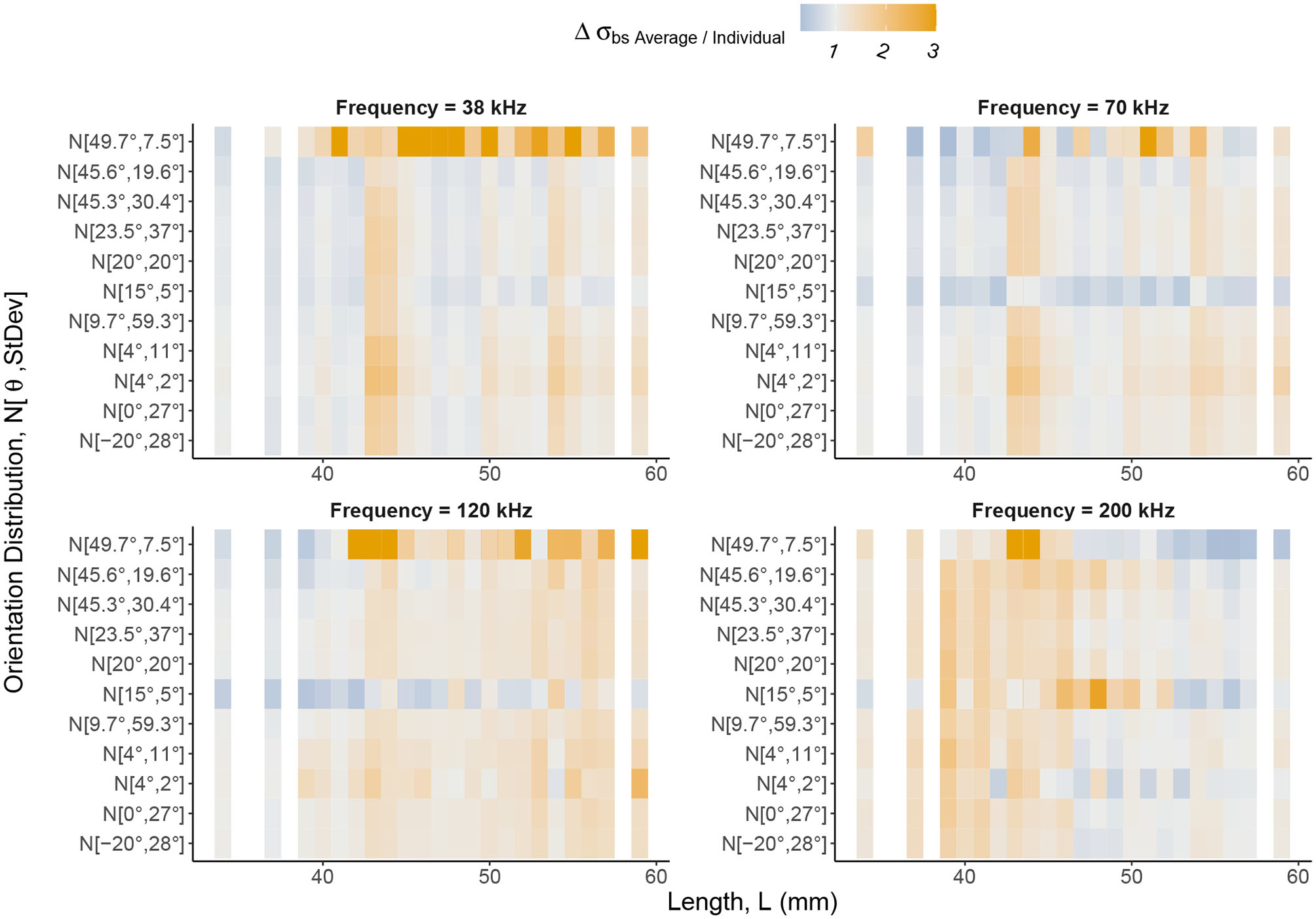 The relative change in backscattering cross-section, Δσbs = σbsAverage/σbsIndividual, between the average and individual, catalog shapes with weighting using orientation distributions applied. Backscattering cross-section can be understood as a linear form of target strength. The Δσbs color scale highlights values of Δσbs greater than one in shades of orange and values between zero and one in shades of blue. Gray regions are where Δσbs is close to one meaning there is little or no change in backscattering cross-section between an average shape and an individual, catalog shape. The notation of the y axis expresses normal distributions of orientation angles in the form where is mean orientation angle and St.Dev is standard deviation. Krill are divided into lengths along the x axis. Distinct vertical bands of Δσbs indicate lengths, regardless of orientation distribution weighting, at which Δσbs is consistent. Therefore, variation in target strength, introduced by considering geometric shape, is persistent despite averaging using orientation distributions. Δσbs is also length dependent, with the region of largest Δσbs shifting to lower lengths as frequency increases as a result of transitions between dominant scattering mechanisms.