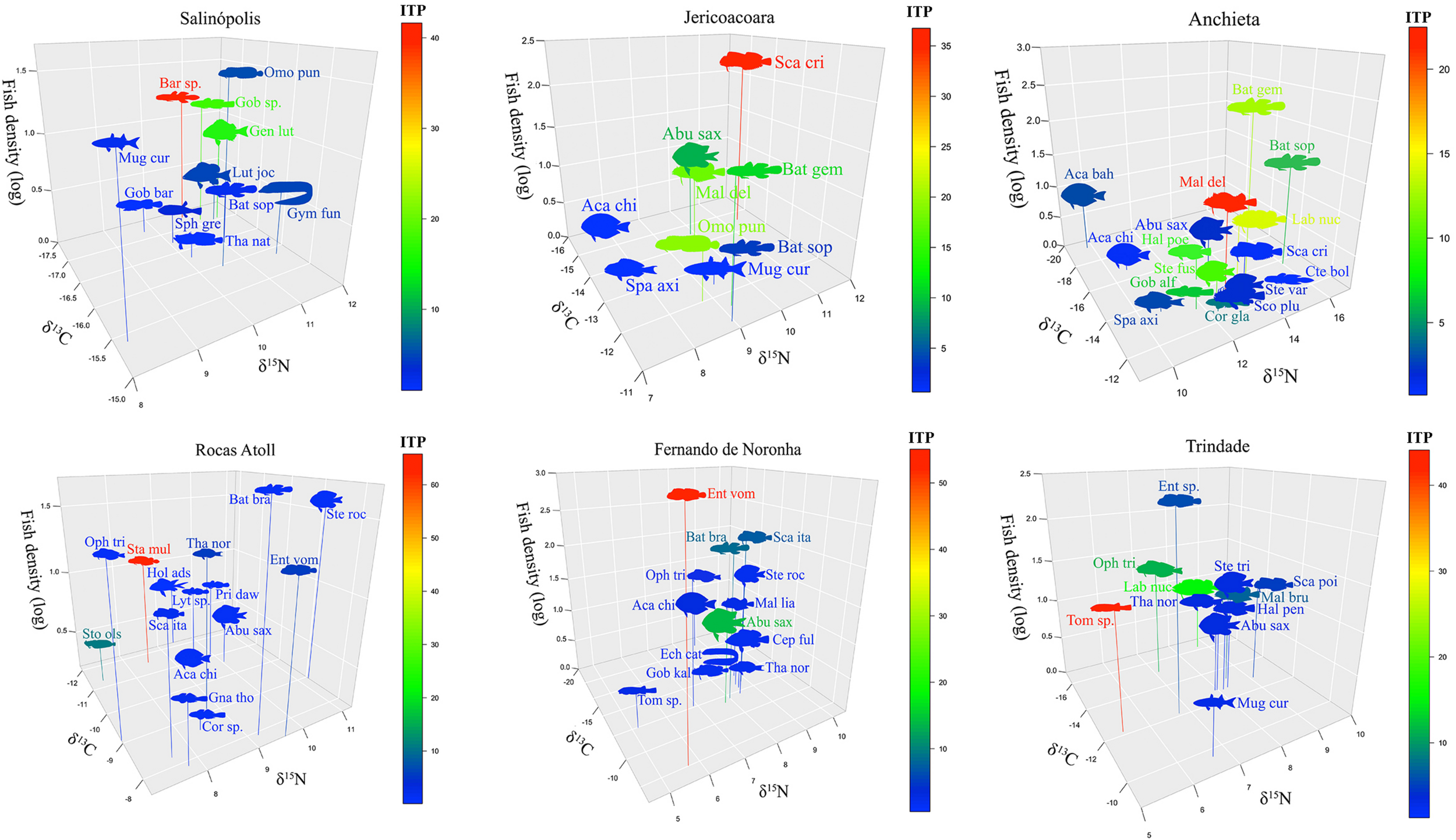 where FDi is the transformed (log+1) mean fish density (ind.m–3) of species i and SEAc is the small sample size cored (i.e., core isotopic niche ellipses) of species i, containing the 95% prediction ellipse interval. This simple approach represents the density of a population in relation to the size of its isotopic niche size, with higher ITP values representing a greater degree of ITP in the species population. Higher ITP implies an abundant species with limited resource use, which a scenario of habitat loss and limited resource availability may pose a threat to the maintenance of population energetic needs. For these analyses we included all fish taxa that had their density estimated during the systematic tidepool surveys and had, at least, three individuals for isotopic niche width estimates.