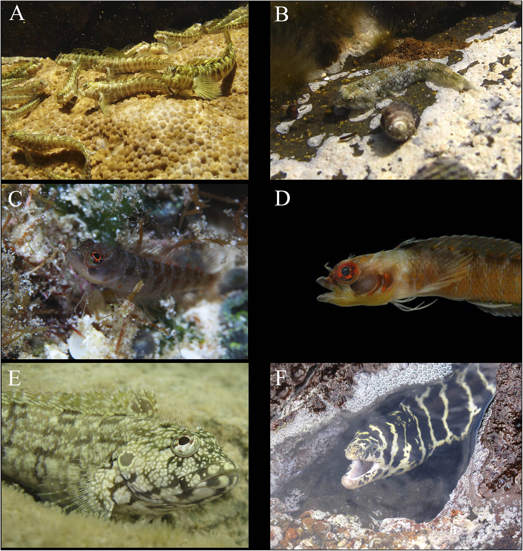 Cryptobenthic intertidal reef fish of the South Atlantic Ocean. A dozen of Entomacrodus vomerinus lumped in a small tidepool (A). A solitary Tomicodon sp. in a rare moment out of a sea urchin crevice (B). Starksia multilepis within macroalgal intertices in an intertidal reef (C) and detail of the small mouth of 2 cm sized individual (D). Juvenile and adult of Labrisomus nuchipinnis(E) often inhabit intertidal reefs, but presented high niche partitioning of habitat and resource uses. The predator Echidna catenata(F).