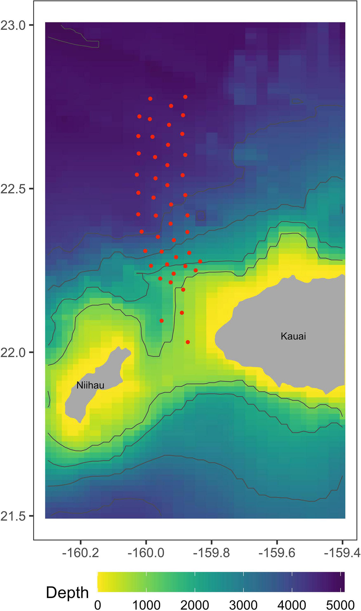Approximate locations of 47 recorded broadband hydrophones at the Pacific Missile Range Facility in Kauai, Hawaii. These hydrophones have the frequency response necessary to detect minke whale boing calls.