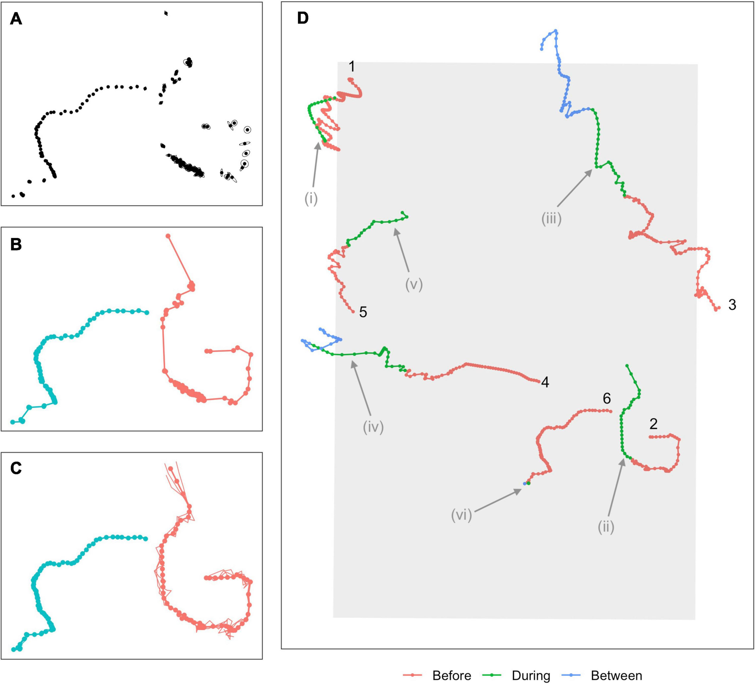 Overview of modeling process. (A) Calls are first detected and localized, with associated measurement errors indicated by ellipses around each point. (B) An association algorithm groups localizations into tracks. (C) A continuous-time movement model is fitted to the tracks, allowing locations and associated location errors to be estimated at any time. Points show estimated mean locations at 5-min intervals (“single imputation”), connected by linear interpolation (thicker solid line). Thinner lines show three simulated plausible trajectories for each animal (“multiple imputation,” points for these tracks suppressed for clarity). (D) A subset of six single-imputation tracks overlapping with the During sonar exposure phase, some of which demonstrate potential avoidance behavior. Colors indicate sonar exposure phase and a track ID number is used to indicate the beginning of the track. Potential avoidance responses include changes in headings (Tracks 1, 2, 3; possible changes indicated at i, ii, iii), increased speed (Tracks 4, 5; indicated at iv, v), more directional movement (Track 3, at iii), or cessation of calling (Track 6, at vi). Evidence of avoidance can be fairly clear (Tracks 1 and 2) but is often ambiguous or inconclusive (Tracks 3–5).