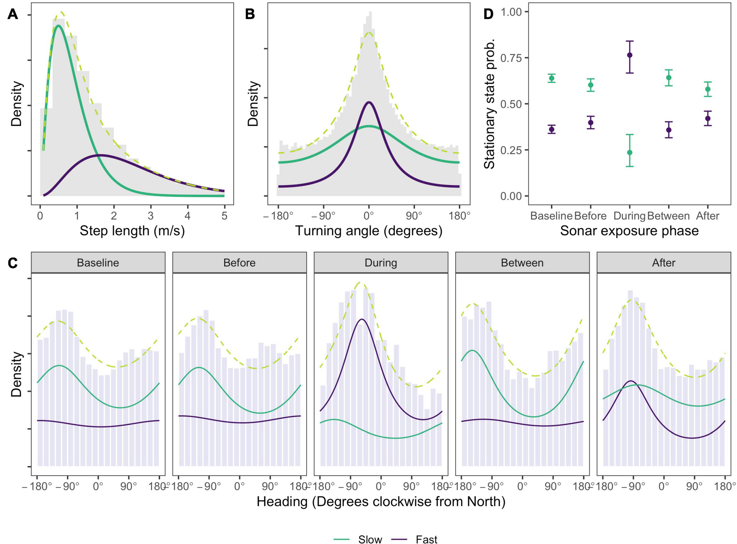 The fast movement state is far more likely to occur in the During phase than in any other phase, and with relatively small differences between any other phases (Figure 3D). After assigning each location to its most likely state using the Viterbi algorithm (Zucchini et al., 2017), the fast movement state accounted for between 35 and 41% of locations in non-sonar phases, compared to 70% of locations in the During phase. Model checking (Supplementary Material 2) revealed no evidence of systematic deviations from model assumptions, although pseudo-residuals for speed and heading exhibited a moderate amount of residual autocorrelation. To check the robustness of our conclusions, the selected HMM was refitted to data thinned to one observation per 15 min to reduce autocorrelation, and found no meaningful differences (Supplementary Material 2). We also checked the sensitivity of our results to the interval used to impute tracks and to the slightly higher call rates that were observed in Between and During phases, again finding no substantive differences (Supplementary Material 2).