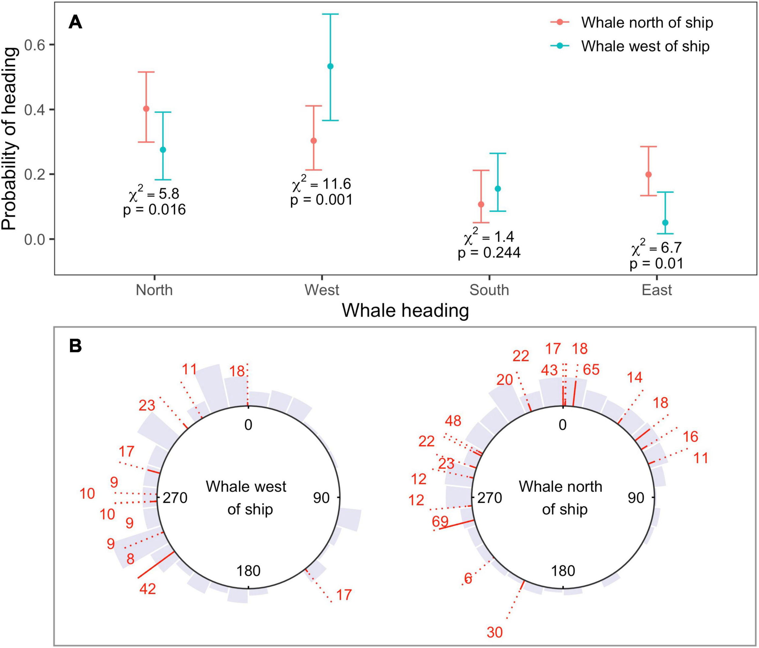 Changes in heading observed for locations in the fast movement state during sonar exposure were consistent with movement away from sonar-producing ships (Figure 4A). Whales were more likely to head north when their bearing was to the north of the closest sonar-producing ship, rather than to the west (N heading χ2 = 5.8, p = 0.02). Similarly, whales were more likely to head west, and less likely to head east, when their bearing was to the west of the closest ship, rather than north (West heading χ2 = 11.6, p < 0.001; East heading χ2 = 6.7, p = 0.01). Model selection by QIC favored the use of an AR(1) correlation structure for all four response variables, and whale bearing was the only significant covariate effect (Supplementary Material 4). Although the use of an independent model for each response direction meant that probabilities were not guaranteed to sum to one over all potential directions, this sum differed negligibly from one (1.01).