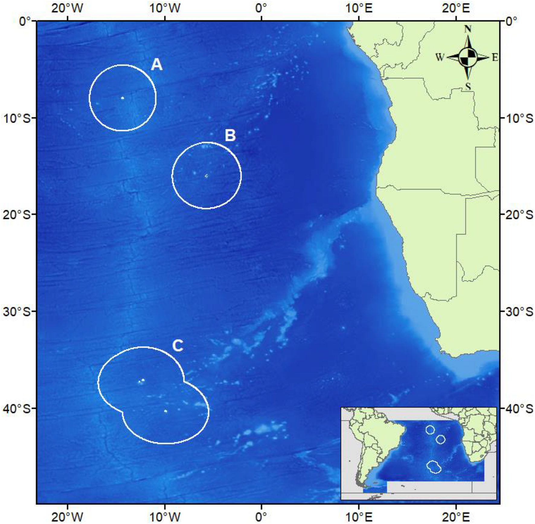 The South-east Atlantic Ocean with the Exclusive Economic Zones of Ascension Island (A), Saint Helena (B), and Tristan da Cunha (C) are drawn in white and correspond to Figures 3A–C. Underlying bathymetry is cropped for the region from General Bathymetric Chart of the Oceans (GEBCO_2014 Grid, version 20150318). Map drawn in WGS84.