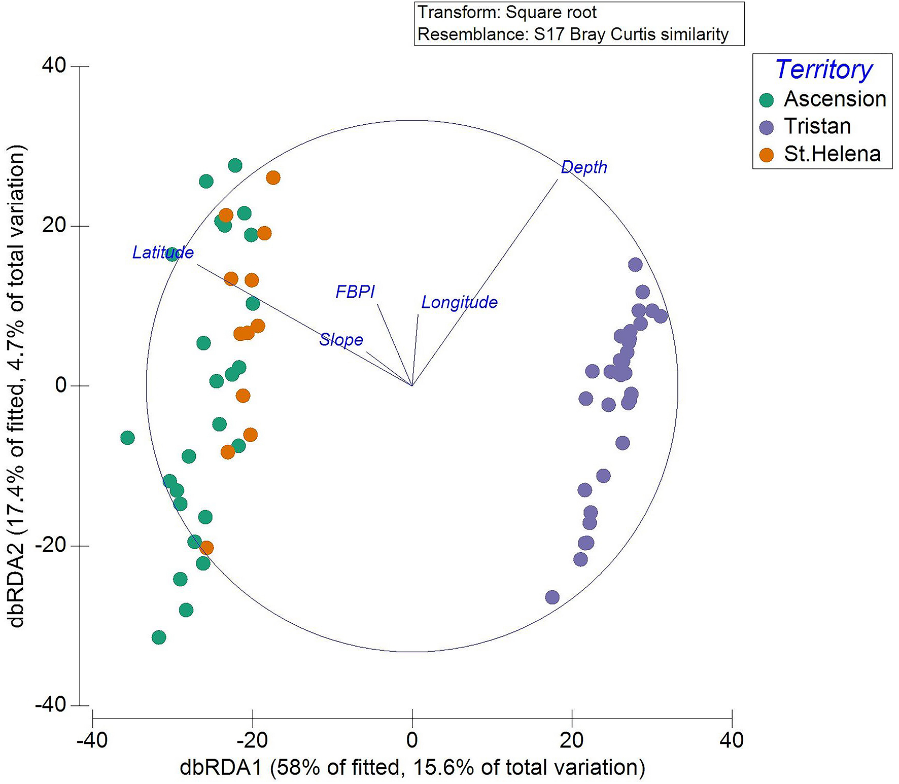 Distance-based redundancy analysis plots allow visualization of the DistLM results for each significant environmental variable (Figure 4). Decreased latitude (poleward movement) drives the separation between Ascension and St. Helena transects and those from Tristan. Increased slope also appears important in separating the tropical from the temperate, although the variance in the biological data that it explains was relatively minor. Depth was important for structuring communities at all territories. The dbRDA plotted by SIMPROF clusters is available in the Supplementary Material.