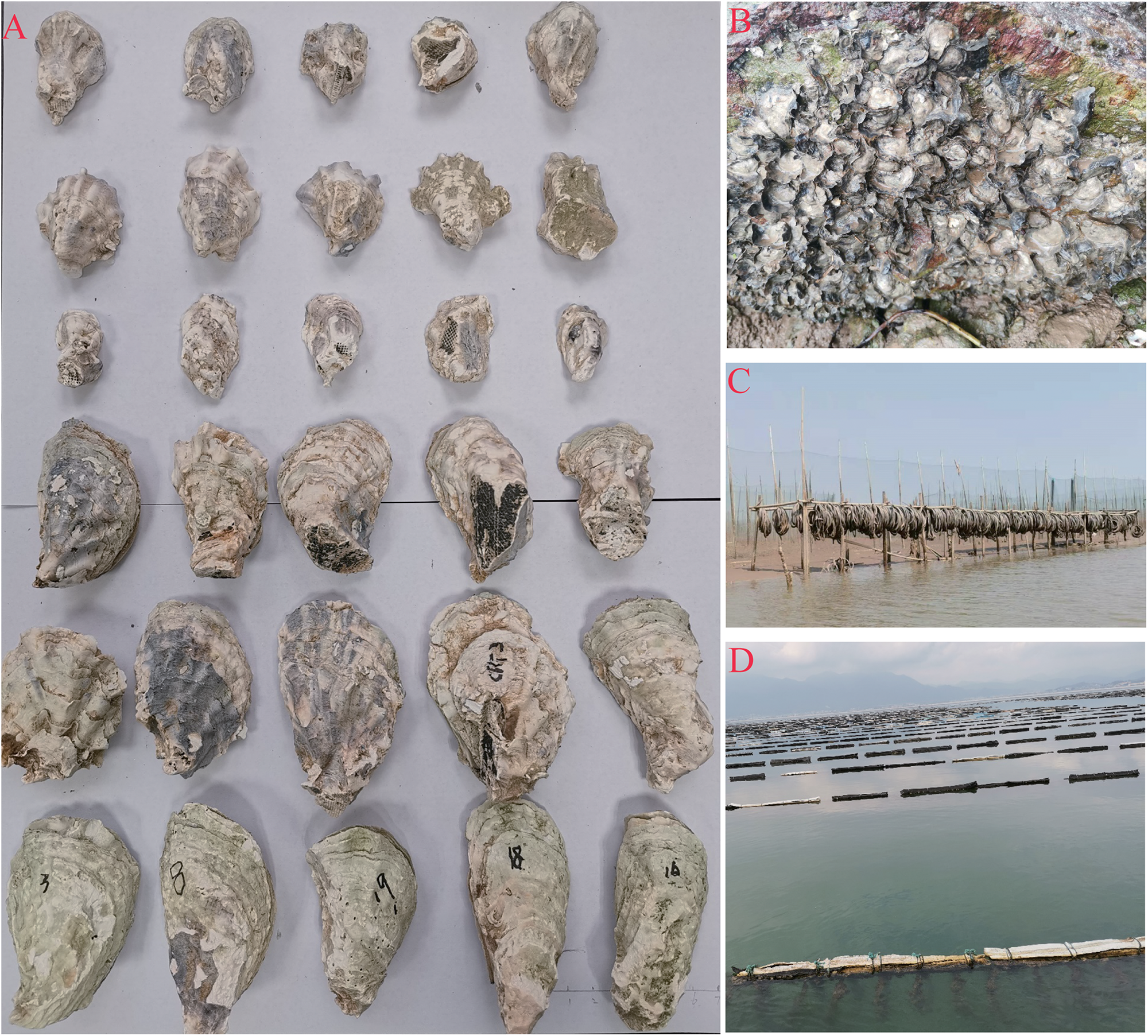 Oyster samples and their habitat. (A) Line 1–3 are cultured Kumamoto oyster sampled in Sanmen bay, Xiangshan bay and Yueqing bay, respectively, line 4 are Portuguese oyster sampled in the Xiangshan bay, line 5 are cultured Portuguese oysters originate of artificial breeding spat from Fujian province and line 6 are adult Portuguese oysters from Fujian province. (B) Oysters grown in the muddy intertidal zone. (C) Oyster seedling collection facilities using the abandoned bicycle tires as attachment in the intertidal zone. (D) The longline cultured oyster facilities in the local area hanging the abandoned bicycle tires directly.