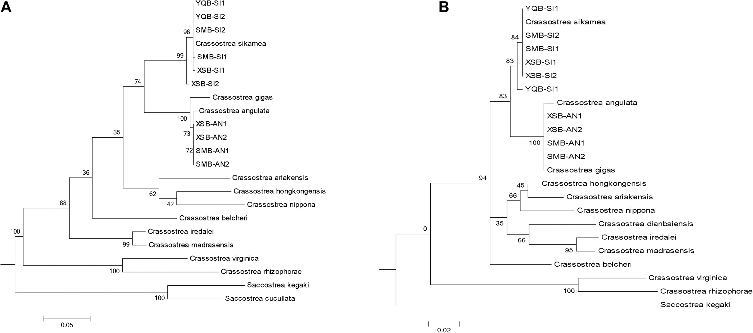 The ITS1 and COI sequences of two identified individuals in each bay are randomly selected and the phylogenetic tree construction of representative oyster species in the database. Accession number of the reference sequences downloaded from NCBI database for (A) COI: Crassostrea_sikamea, EU007477; Crassostrea_angulata,LC383463; Crassostrea_gigas, MN862563; Crassostrea_hongkongensis,KP734091; Crassostrea_ariakensis, KF272859; Crassostrea_nippona, FJ743531; Crassostrea_belcheri, JF915511; Crassostrea_iredalei, JF915503; Crassostrea_madrasensis, JF915507; Crassostrea_virginica, KU905908; Crassostrea_rhizophorae, HM003498; Saccostrea_kegaki, LC110472. (B) ITS1: Crassostrea sikamea, FJ222345; Crassostrea hongkongensis, FJ222331;Crassostrea gigas, KM460835; Crassostrea ariakensis, EU252081;Crassostrea angulata, KU726937;Crassostrea nippona, FJ356679; Crassostrea belcheri, EU073256; Crassostrea iredalei, FJ222362;Crassostrea madrasensis, EU073237; Crassostrea dianbaiensis, AB972050; Crassostrea virginica, EU073344; Crassostrea rhizophorae, KF370460; Saccostrea kegaki, LC111294.