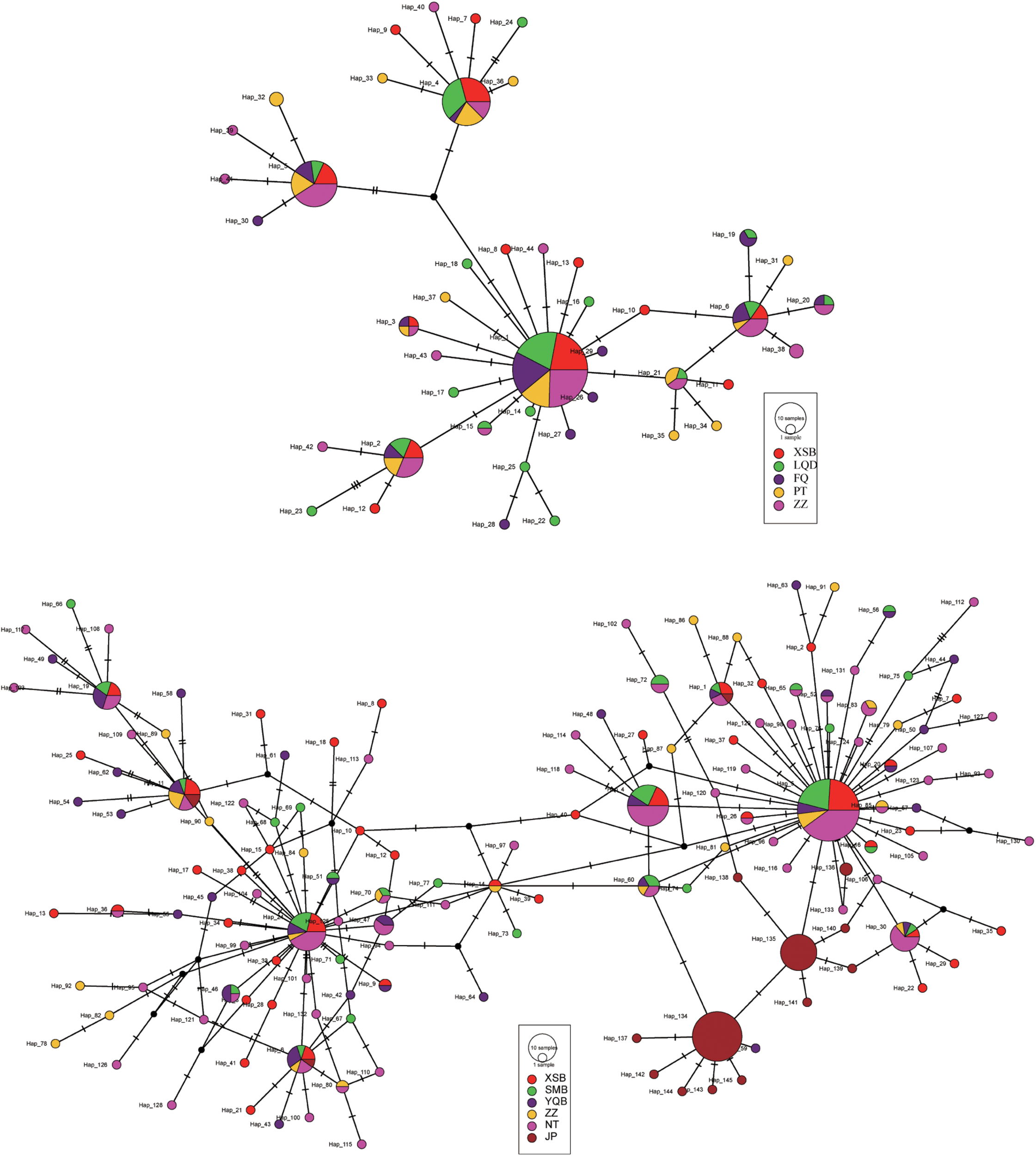 Two mitochondrial sequences (COI and MNR) were amplified for genetic diversity analysis, and a COI fragment of 603 bp was obtained from 188 specimens of the Portuguese oyster. In total, 49 segregating sites and 44 haplotypes were identified. Haplotype diversity and nucleotide diversity were 0.836 ± 0.046 and 0.353 ± 0.039% for XSB and 0.869 ± 0.031 and 0.428 ± 0.036% for ZZ populations, respectively. For Kumamoto oysters, 543 bp sequences from 366 individuals were analyzed, and 105 segregating sites and 145 haplotypes were defined. Haplotype diversity ranged from 0.929 ± 0.027 to 0.983 ± 0.017 for XSB, SMB, YQB, and ZZ populations, and the nucleotide diversity ranged from 0.586 ± 0.053% to 0.727 ± 0.063% (Table 4).