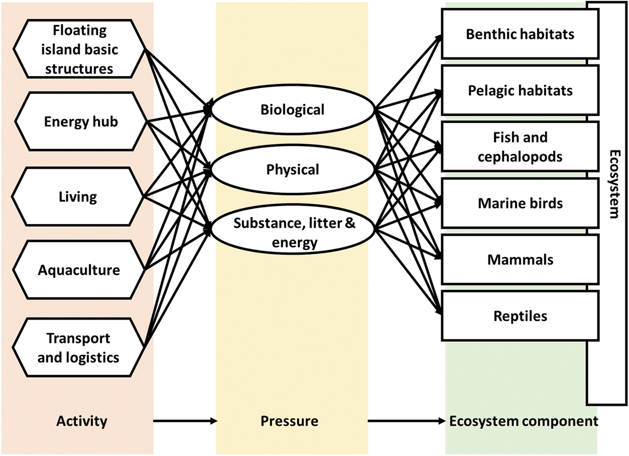 An environmental assessment is required to predict the environmental impacts of proposed initiatives before they are allowed to be carried out. There are many types of environmental assessments, e.g., “environmental impact assessment” (EIA), “strategic environmental assessment” (SEA), “cumulative effect assessment” (CEA), “cumulative impact assessment” (CIA), and “environmental (or ecological) risk assessment” (ERA). Although many different approaches exist, serving different purposes in various contexts under different names, they all share the common goal of assessing the effect, impact, or risk of human activities on the ecosystem (Tamis et al., 2016). These approaches therefore all have in common that they require a framework building on the principle that activities cause pressures that may lead to adverse effects on the ecosystem (Knights et al., 2013, 2015; Tamis et al., 2016). Such a framework falls within the concept of a mental or conceptual model, which is used across a diverse spectrum of academic disciplines to think and communicate about human-environment interactions (Lynam et al., 2012). The use of an appropriate environmental assessment methodology should provide a solid, broadly applicable and transferable basis to guide the (further) development of an ecological knowledge base for offshore floating island initiatives.