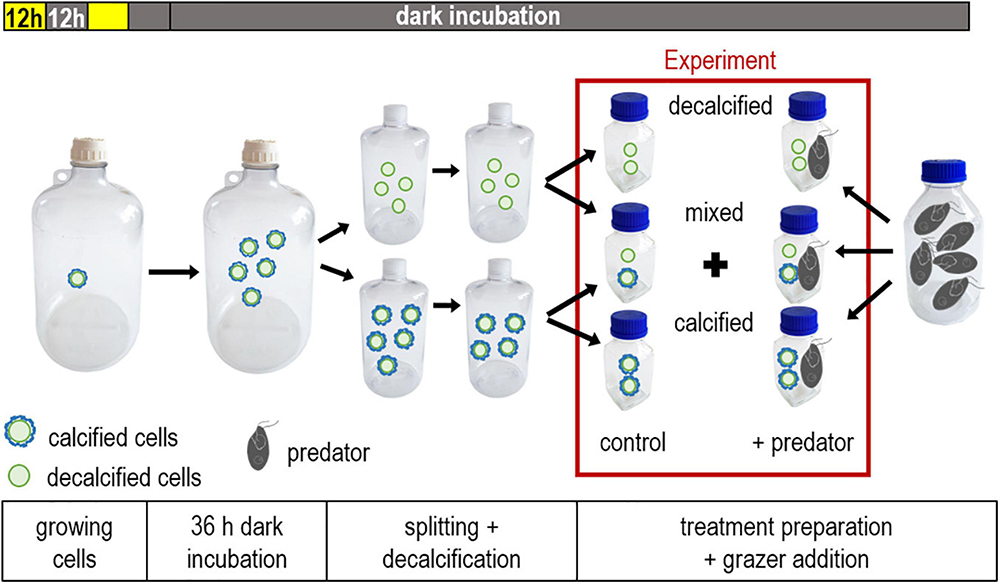 The coccolithophores E. huxleyi (B92/11), G. oceanica (RCC 1303) and P. carterae (unknown strain number) were grown separately in a large volume (5 L) of medium and raised to high cell densities for the 3 predation experiments (∼275 × 103E. huxleyi cells mL–1, ∼220 × 103P. carterae mL–1, ∼130 × 103G. oceanica mL–1), in order to have a certain margin for the dilution steps that followed later, when the concentrations between the treatments were adjusted and the grazer cultures was added (described below) (Figure 1). Thereupon, the coccolithophore cultures were incubated in the dark for 36 h to stop the growth of the cells. The first 12 h of the dark incubation corresponded to the regular 12-h night cycle during which cell division took place. The goal of the subsequent 24 h of darkness was to deplete the energy reserves of the coccolithophore cells through respiration, in order to reduce the ability of the cells to build a new layer of coccoliths in the dark after the decalcification treatment was completed. All further steps during the dark incubation were conducted under low light conditions (<0.01 μmol photons m–2 s–1) to keep energy inputs via photosynthesis at a minimum during handling.