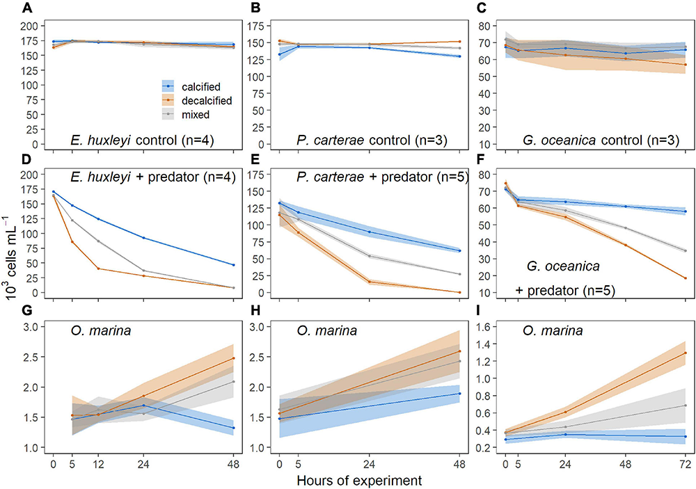 Concentrations (mean ± SD) of E. huxleyi(A,D), P. carterae(B,E), G. oceanica(C,F) in the treatments without (A–C) and with (D–F) predators. Concentrations (mean ± SD) of O. marina in the respective treatments with E. huxleyi(G), P. carterae(H), G. oceanica(I). Blue symbols = calcified, red = decalcified, gray = sum of calcified and decalcified cells in the mixed treatment.