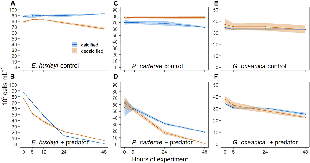 Concentrations (mean ± SD) of calcified (blue) and decalcified (red) cells within the mixed treatment. (A)E. huxleyi without, and (B) with grazers. (C)P. carterae without and (D) with predators. (E)G. oceanica without and (F) in the presence of O. marina.