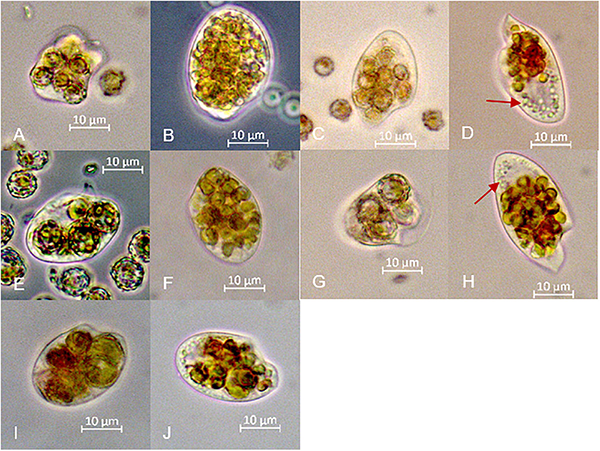 Microscopic images of different individuals of O. marina with ingested prey. (A) calcified and (B) decalcified E. huxleyi after 24 h. (C) calcified and (D) decalcified E. huxleyi after 72 h. (E) calcified and (F) decalcified G. oceanica after 24 h and (G) calcified (H) decalcified cells after 72 h. (I) calcified and (J) decalcified P. carterae after 24 h. Red arrows point to the small spherical objects in the apical part of the predatory cells, which resemble prey cells in an advanced stage of digestion.