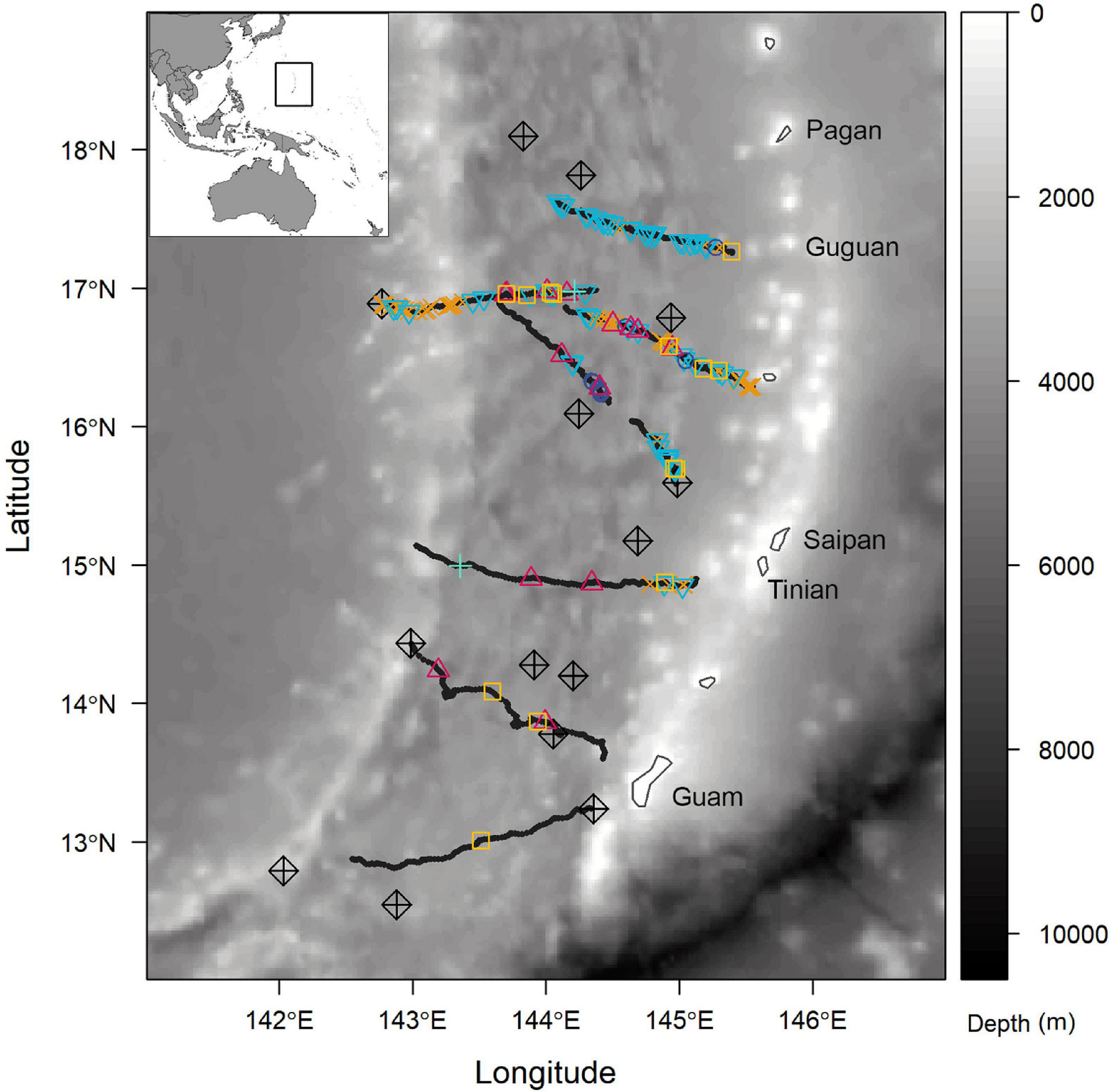 Bathymetric map of the Mariana Archipelago with DASBR tracks (bold black lines), acoustic detections (2-min files) of beaked whales and Kogia spp. (Blainville’s = blue downward triangle; Cuvier’s = orange “x”; Longman’s = purple circle; BWC = yellow square; Kogia spp. = pink upward triangle; unknown BW = teal cross), and locations of conductivity-temperature-depth (CTD) casts (black diamonds) overlaid. Bathymetry pulled from R-package “marmap” (Pante and Simon-Bouhet, 2013).