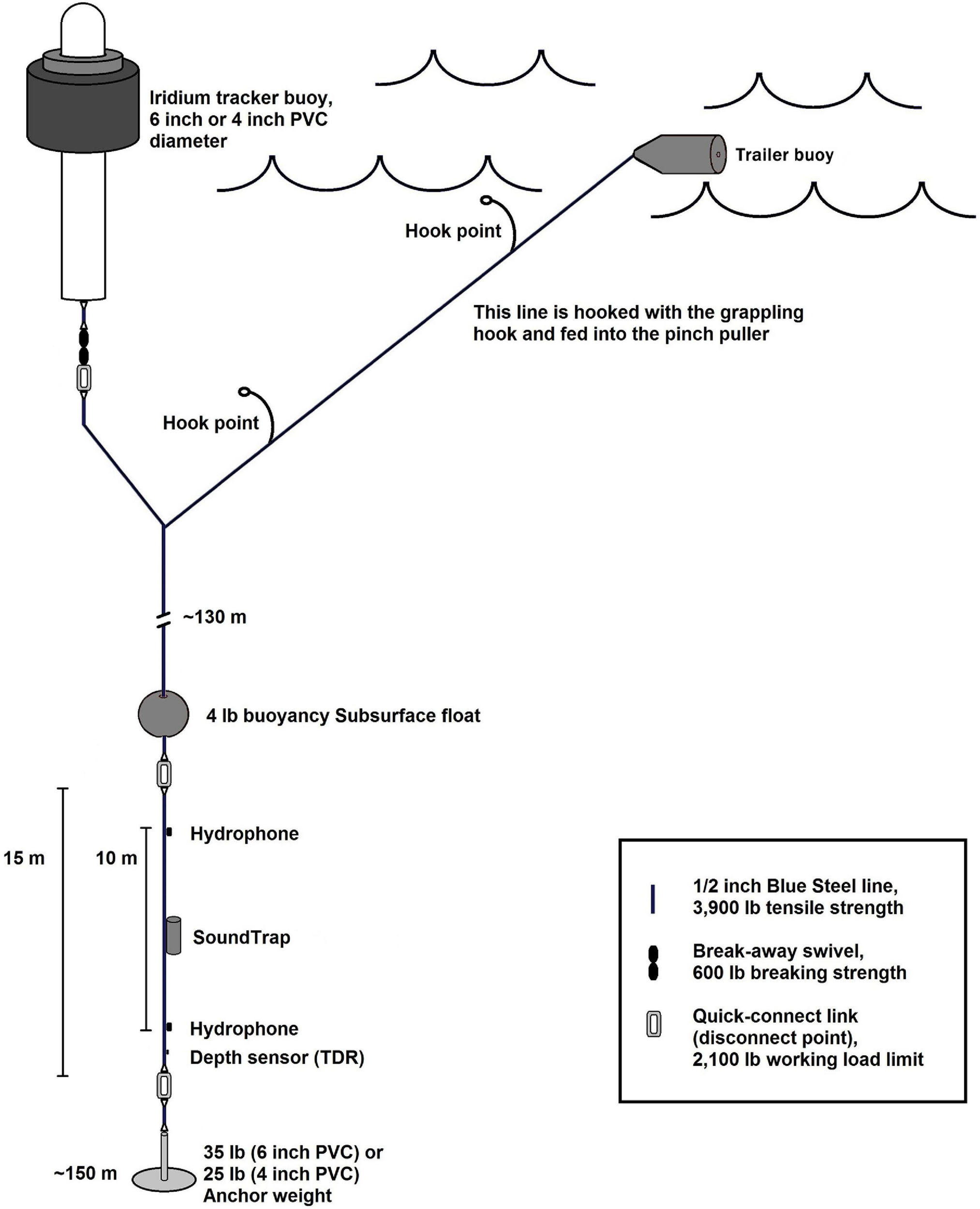 The PIFSC DASBR is based on the design of Griffiths and Barlow (2015), but modified to withstand the rough seas and higher water temperatures common to the tropical central and western Pacific (Figure 2). The DASBR includes a spar-buoy surface float with trailing line and trailer buoy for recovery, 150 m of 1/2-inch (1.3 cm) line, and an anchor at the bottom. The spar-buoy contains an Iridium satellite tracker (NAL 9602-AB) that provides GPS location at programmed time intervals (typically every 2 h). A multi-channel (up to 4) SoundTrap ST4300-HF (Ocean Instruments, Auckland, New Zealand) is attached to the section of line 15 m above the anchor, with two hydrophones (HTI-92 & HTI-96; High Tech, Inc., Long Beach, MS, United States) spaced 10 m apart, one above and one below the ST4300-HF (Figure 2).