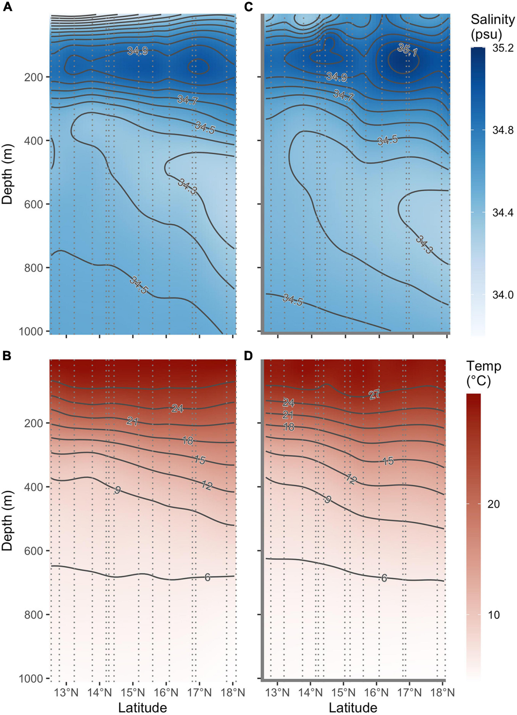 Fourteen CTD casts were conducted across the survey area (Figure 1). Evaluation of the temperature and salinity data from the CTDs revealed differences in the physical characteristics of the water. The stations sampled to the north of 15.5°N have a strong salinity maximum at ∼100–200 m and a deep salinity minimum near 600 m, consistent with North Pacific Tropical Waters (Suga et al., 2000; Suntsov and Domokos, 2013). A surface salinity front can be seen near 15°N (Figure 3A). Waters to the south of this front have a surface salinity minimum and a deep salinity maximum weaker than that found to the north. Temperature and salinity values from the CTD and modeled HYCOM data from the same location on the same date were highly correlated (r = 0.998 and r = 0.730, respectively) (Figure 3).