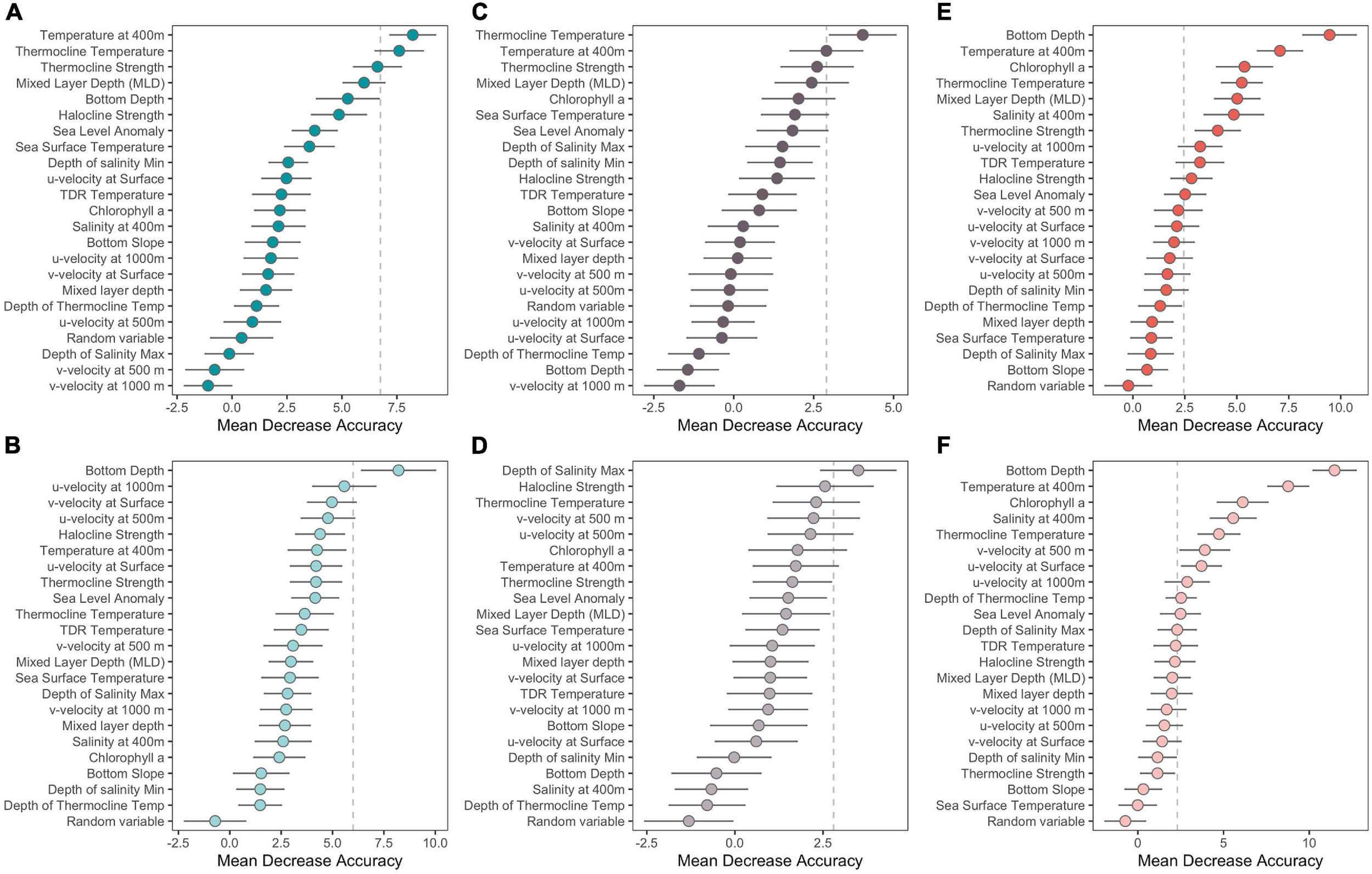 To determine which environmental covariates were predictive of whale distribution, we used a formulation of the Random Forest (RF) machine learning approach, Ensemble Random Forest (ERF), following Siders et al. (2020). Because beaked whales and Kogia spp. have different foraging patterns and habitat utilization one model might not be able to successfully predict the distribution of all species. Therefore, we built three different ERF models for GPS associated encounters: one for all detected species (beaked whales and Kogia spp.), one for Blainville’s beaked whales, and one for Cuvier’s beaked whales. There were not enough GPS associated encounters of Longman’s beaked whales, BWC, or Kogia spp., to attempt to model their distributions within a single-species model. Given the clear oceanographic shift that is generally apparent near 15°N within the Mariana Archipelago region and the uneven distribution of the encounters within the study area, in addition to building the three ERFs for the full study region, we built ERFs for each species grouping that included GPS associated encounters and environmental covariates from north of 15.5°N only. Modeling the northern area separately allowed us to resolve finer scale environmental variability in the ERFs that might otherwise be overwhelmed by the more significant oceanographic differences between the northern and southern portions of the study region. Thus, we generated a total of six ERF models using the same construction methods for all areas.